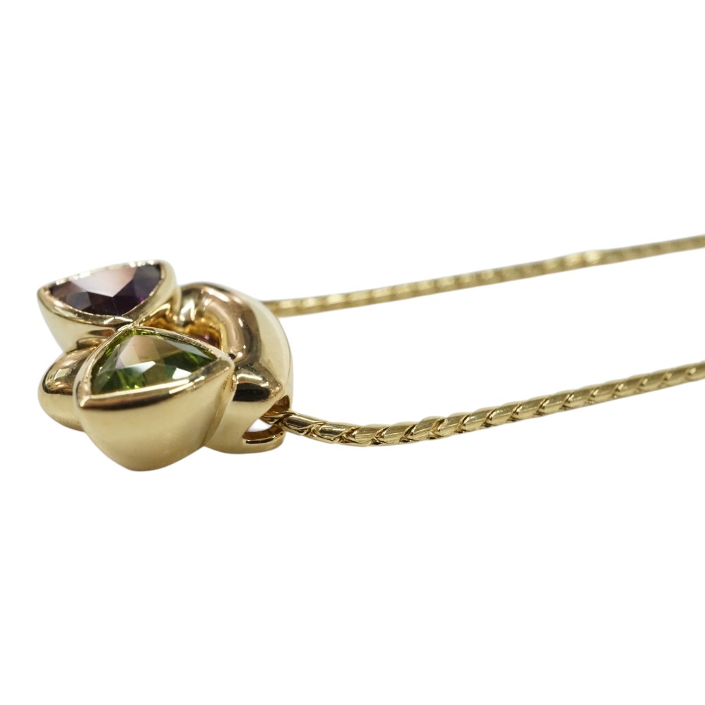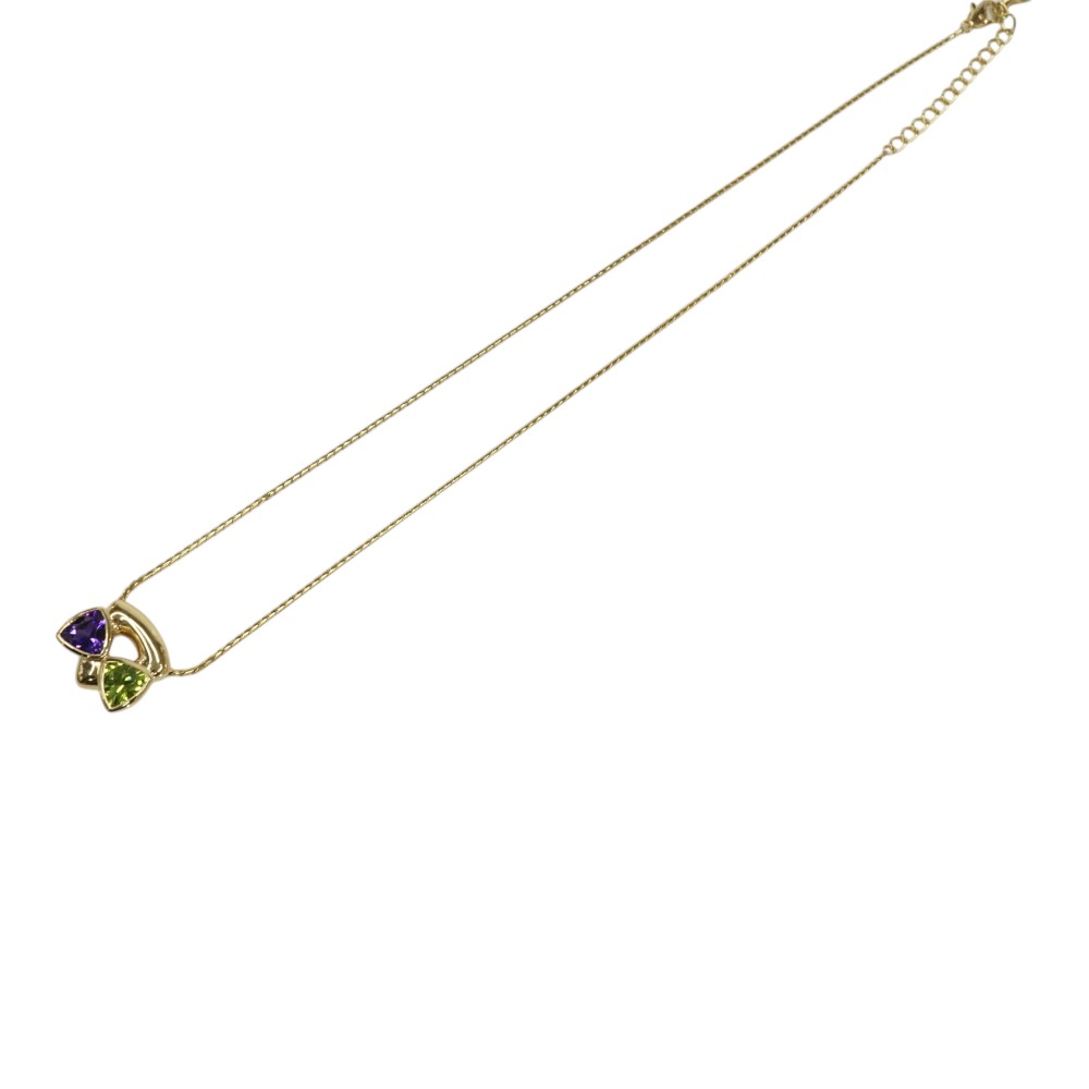 煌びやかに輝くペリドットアメジストの組み合わせが美しいアイテムです。 シンプルなデザインながら、胸元を華やかに彩ってくれます。 お探しの方はこの機会に是非いかがでしょうか。