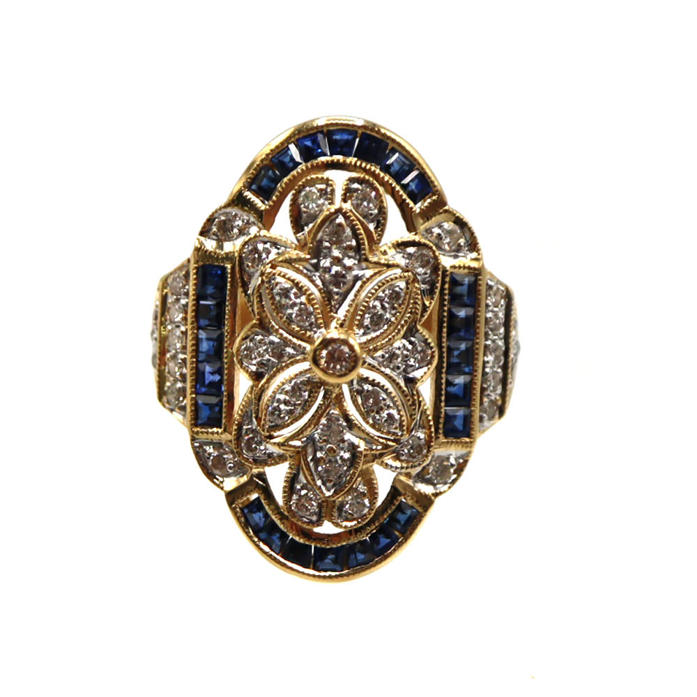 上質なK18(18金)を使用した、ブルーサファイアとダイヤモンドの華やかなリングのご紹介です。