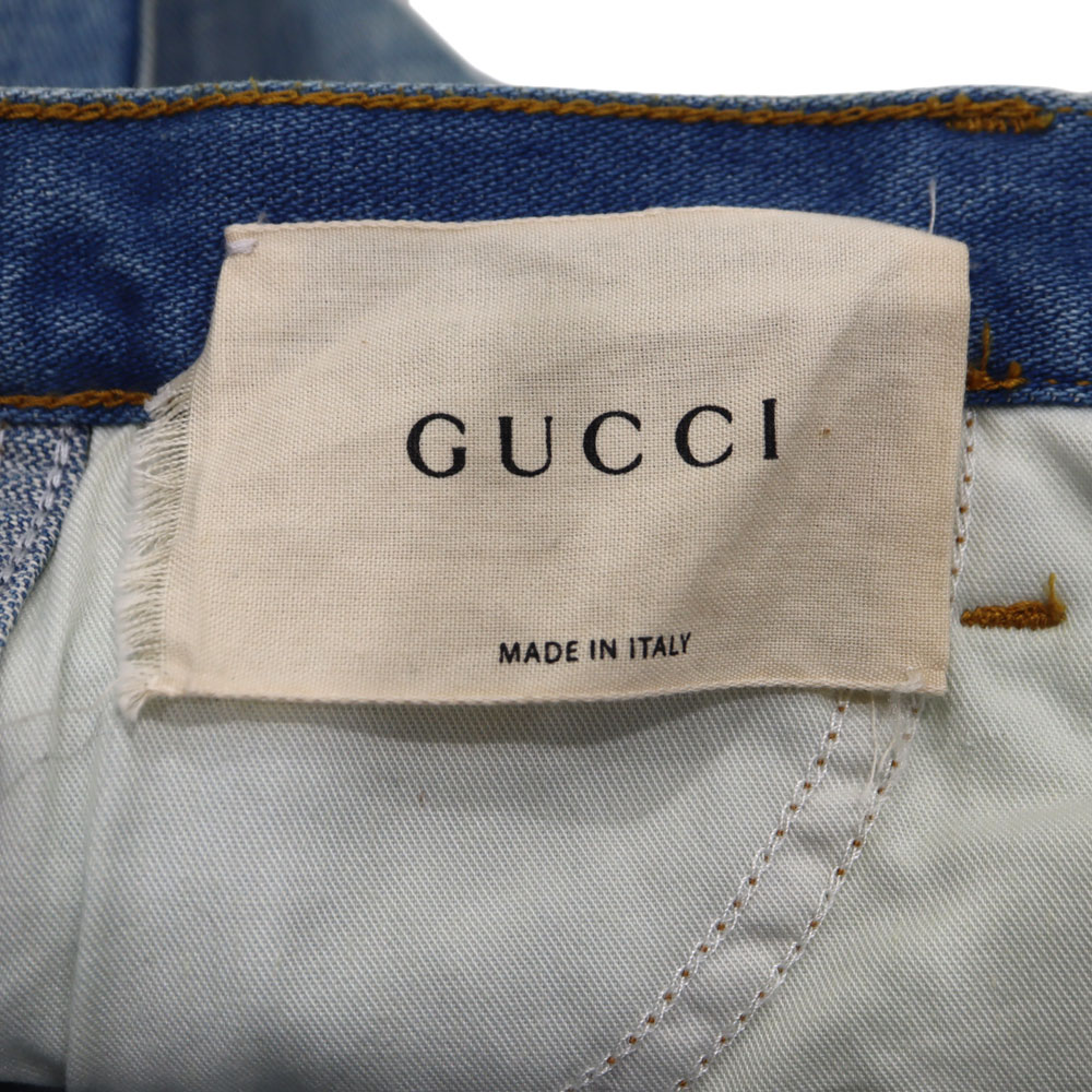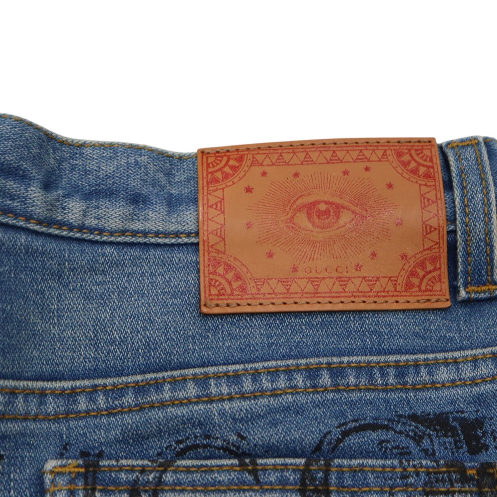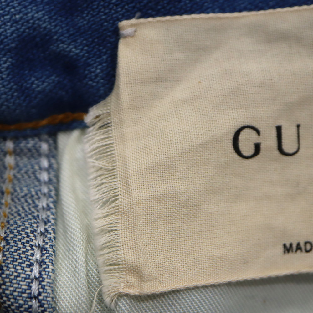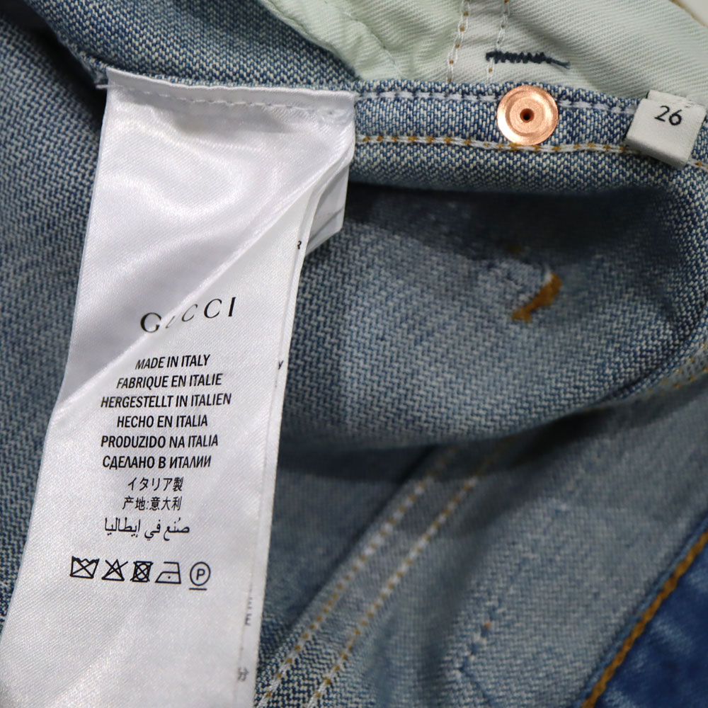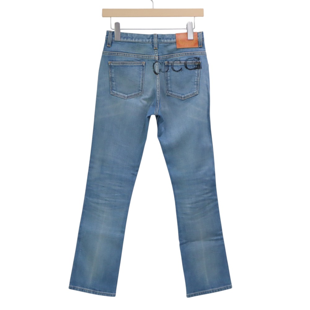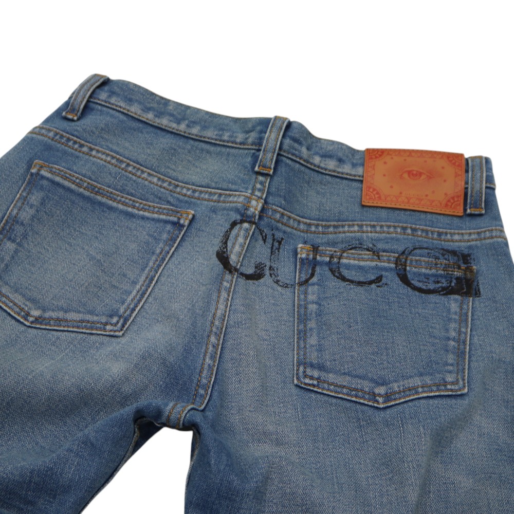 レザーパッチ魅力的なと背面のGUCCIのプリントが目を惹くジーンズです。