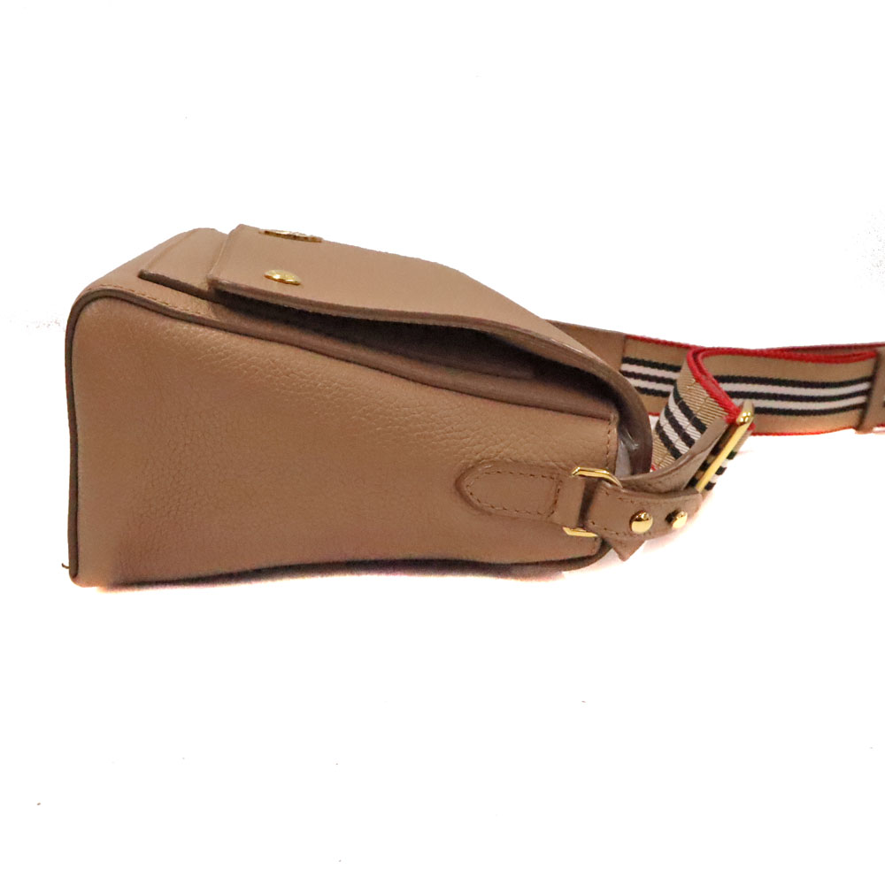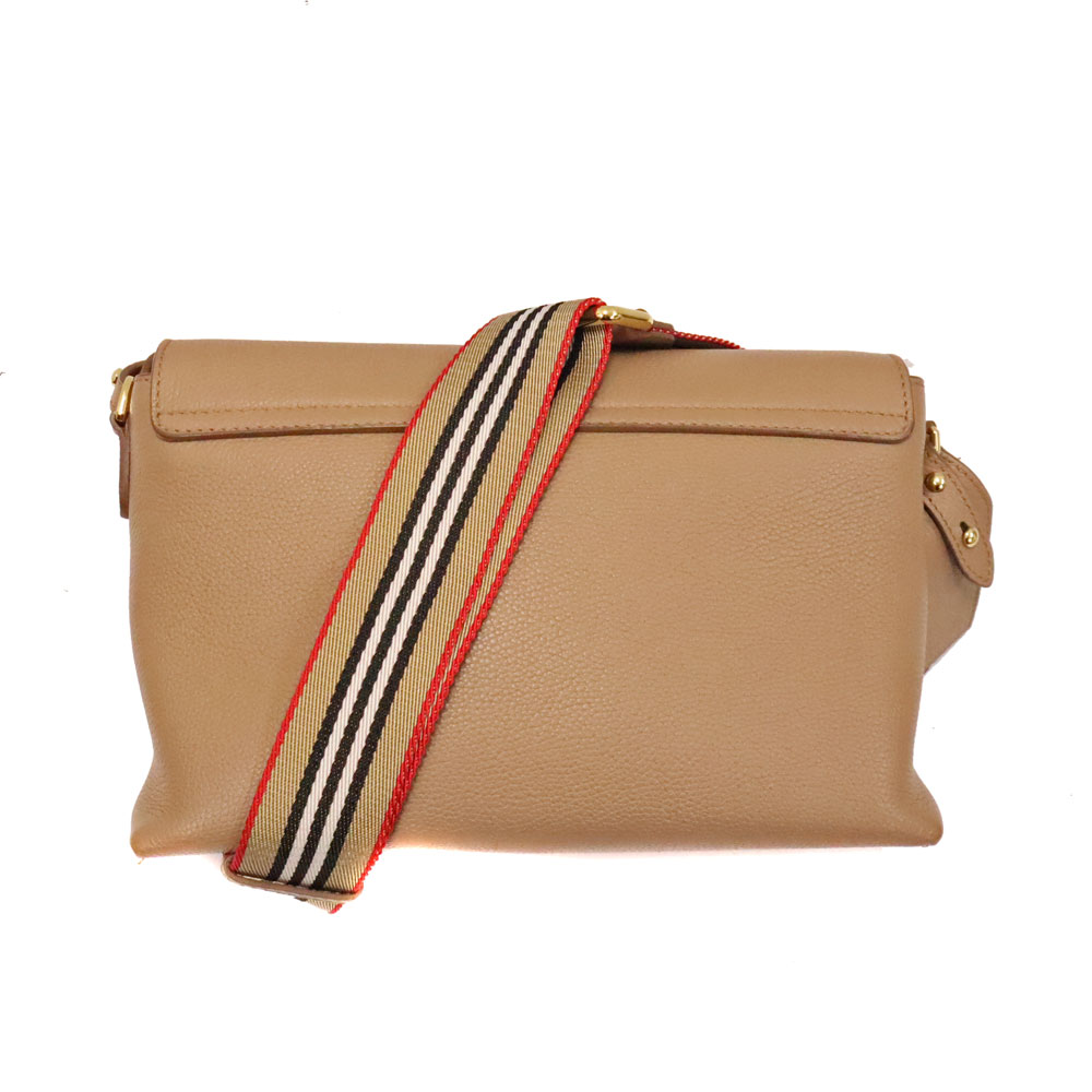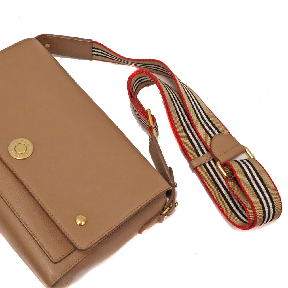 柔らかい手触りでシボの美しい上質なカーフレザーを使用。 ロゴが刻印された光沢のあるスナップとアイコンストライプのストラップが目を惹きます。 ショルダーストラップを外し、クラッチバッグとしても使用可能です。