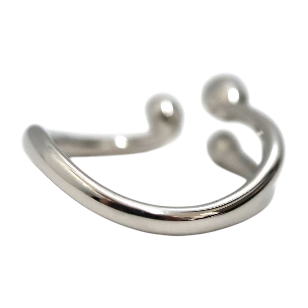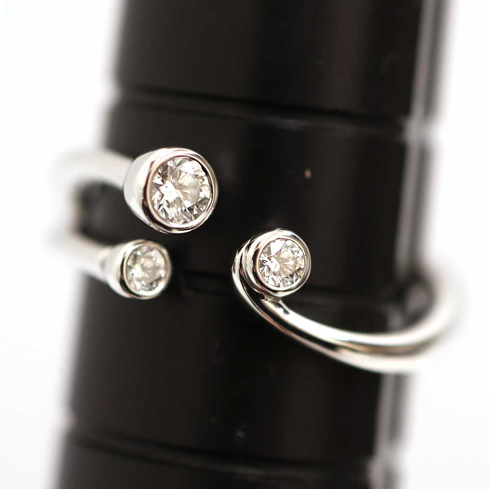 滑らかな曲線を描くオープンタイプのリングは、指に優しくフィットし、洗練された印象を与えます。 両端にはサイズの異なるダイヤモンドがセッティングされており、それぞれが繊細に輝きながら絶妙なバランスを演出しています。 この機会にぜひいかがでしょうか。