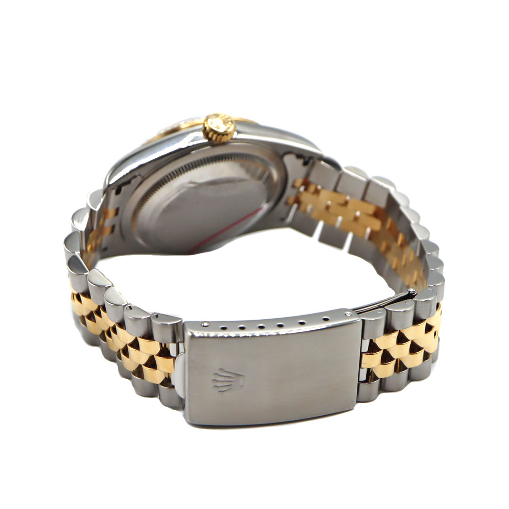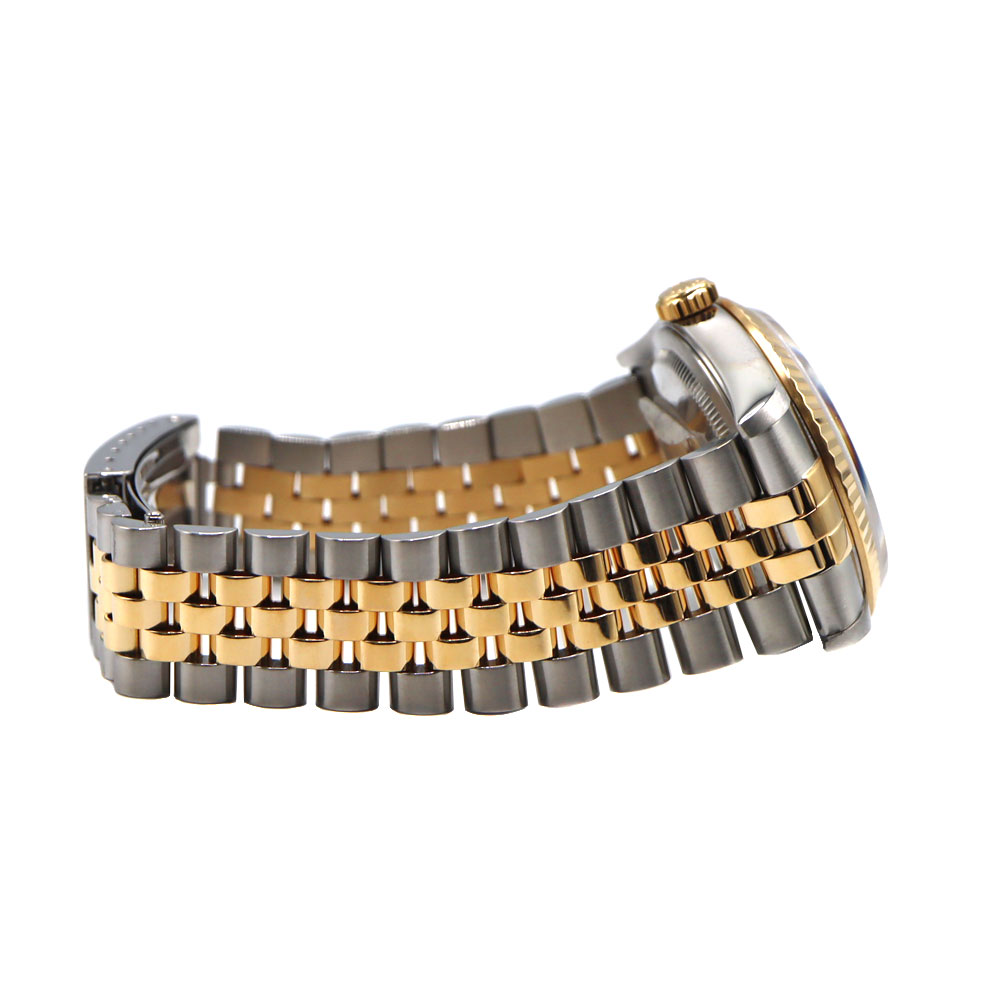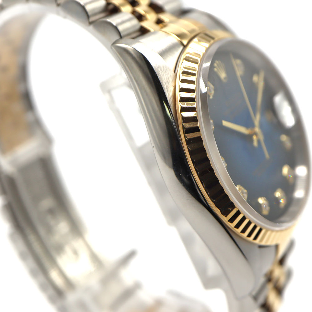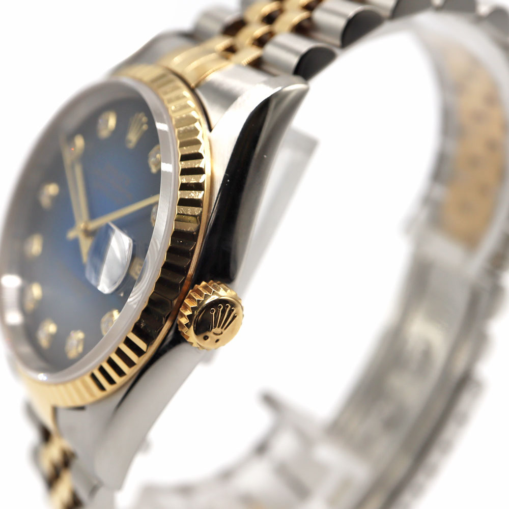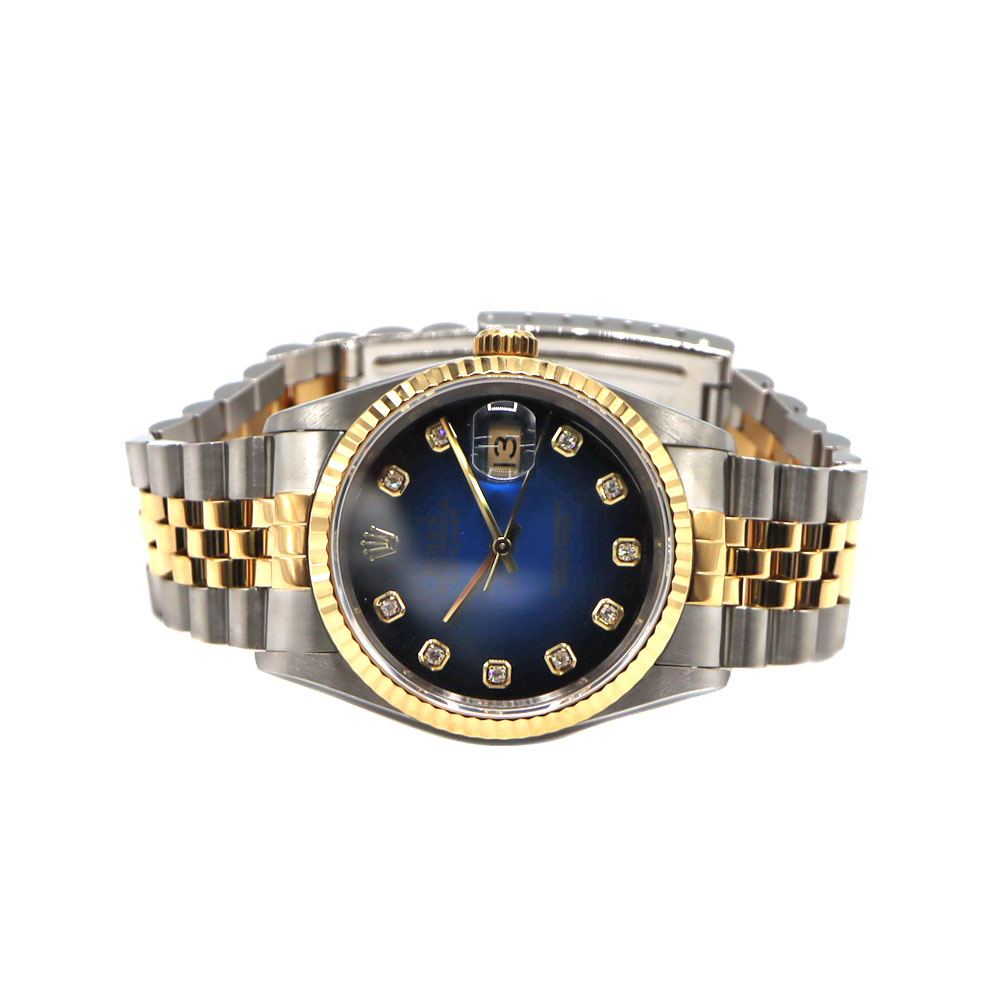 デイトジャストとは午前0時頃瞬時に日付が変わるデイトジャスト機構、全回転式ローターを搭載したパーペチュアル機構、ロレックス三大機構を搭載したモデルです。 珍しいブルーグラデーションの文字盤と10Pのダイヤがとても美しいモデルです。