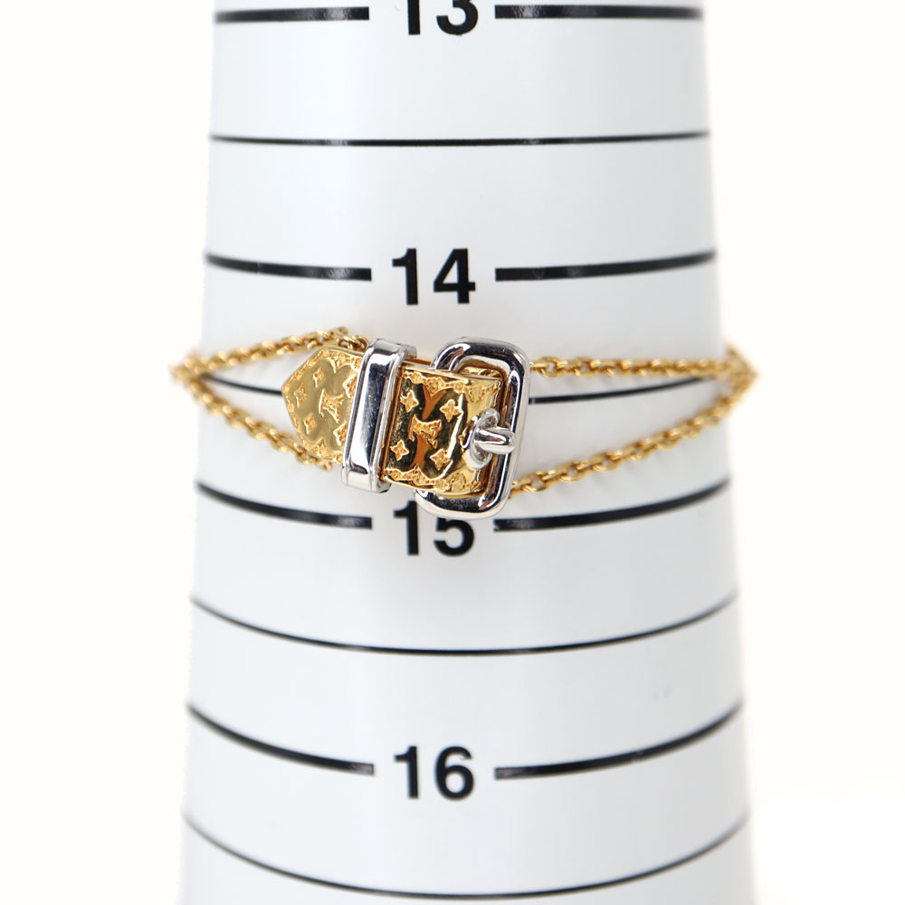 ベルトがモチーフになったデザイン性のあるブレスレットです。 モチーフ自体にボリュームがあるので、男性でもおしゃれに身に着けることができます。 チェーンも2連に重なっているように見えるデザインなので、これ一つで手元を華やかにすることができます。