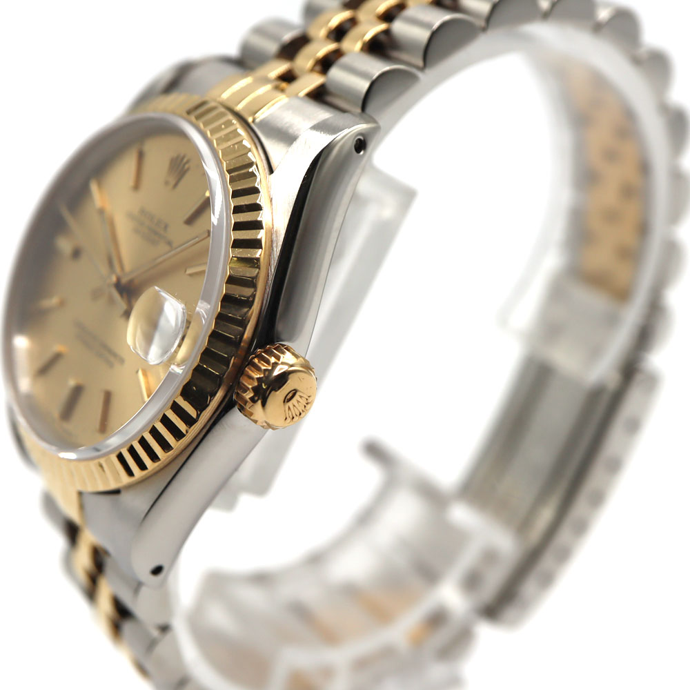 デイトジャストとは午前0時頃瞬時に日付が変わるデイトジャスト機構、全回転式ローターを搭載したパーペチュアル機構、ロレックス三大機構を搭載したモデルです。 美しいカッティングが施されたフルーテッドベゼルとブレスレット中央パーツに18Kイエローゴールドを使用したラグジュアリー感溢れるモデルですので、手元を華やかにしてくれます。