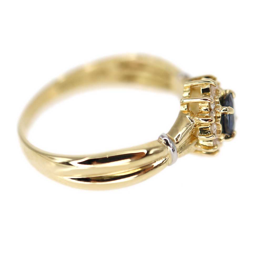 中央にサファイアがセッティングされたデザインが特徴です。 サファイアを囲むようにセッティングされたダイヤモンドが美しい輝きを放ちます。 ゴールドの華やかさと、さりげないプラチナの上品さを兼ね備えた指輪です。