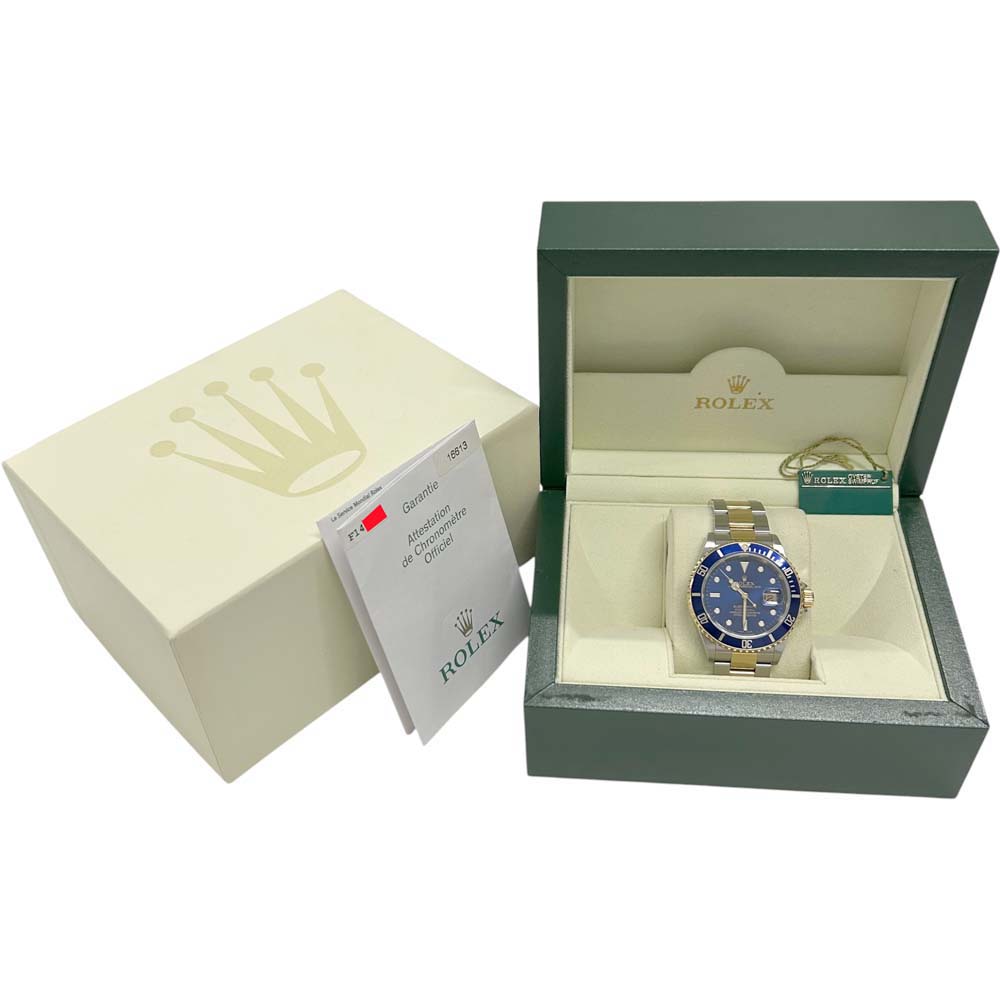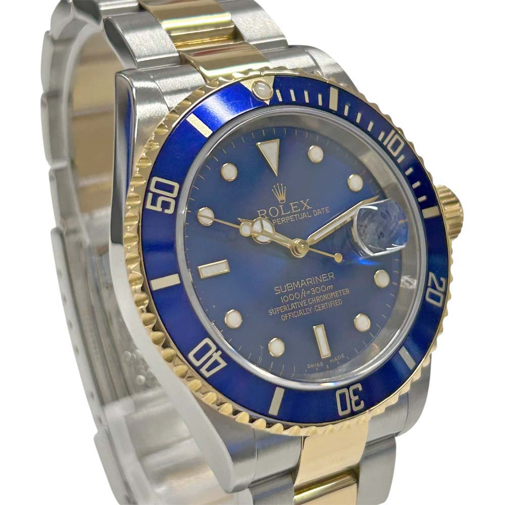 | 商品説明 | ロレックスのサブマリーナデイト16613は、人気のある潜水用腕時計です。特徴的な青や黒のダイヤルとベゼル、ステンレススチールと18Kイエローゴールドのコンビネーションが魅力です。自動巻きムーブメントを採用し、回転式のベゼルは潜水時間の計測に役立ちます。防水性能にも優れており、耐久性が高いことで知られています。