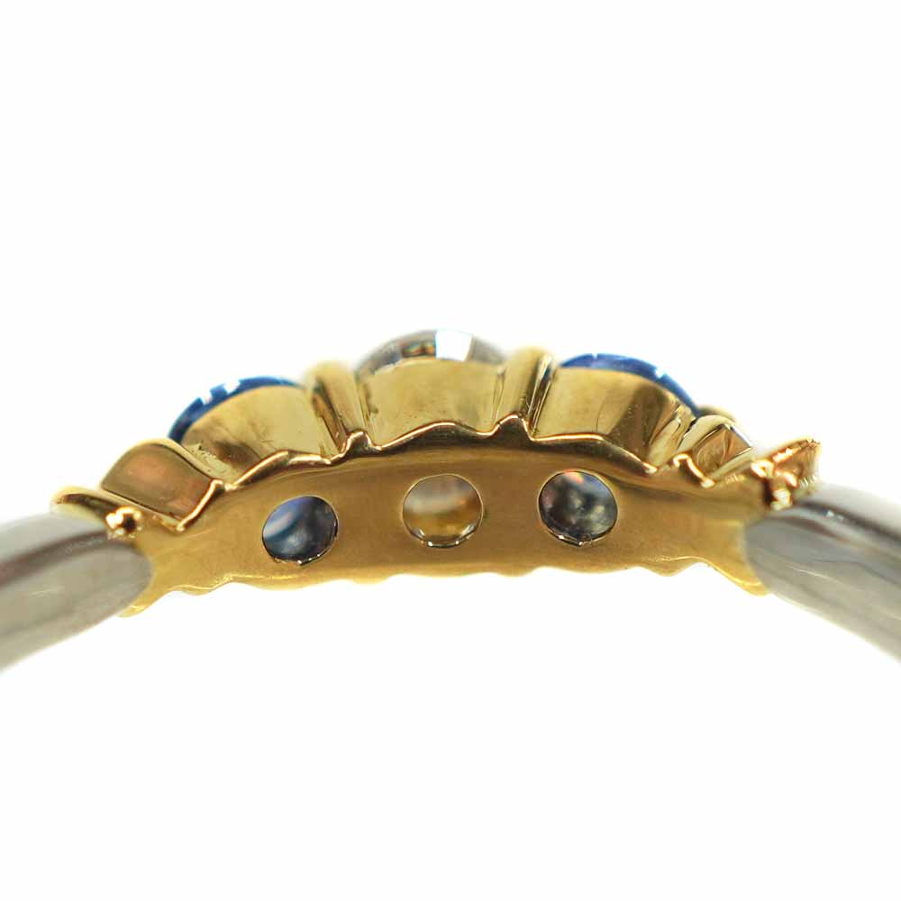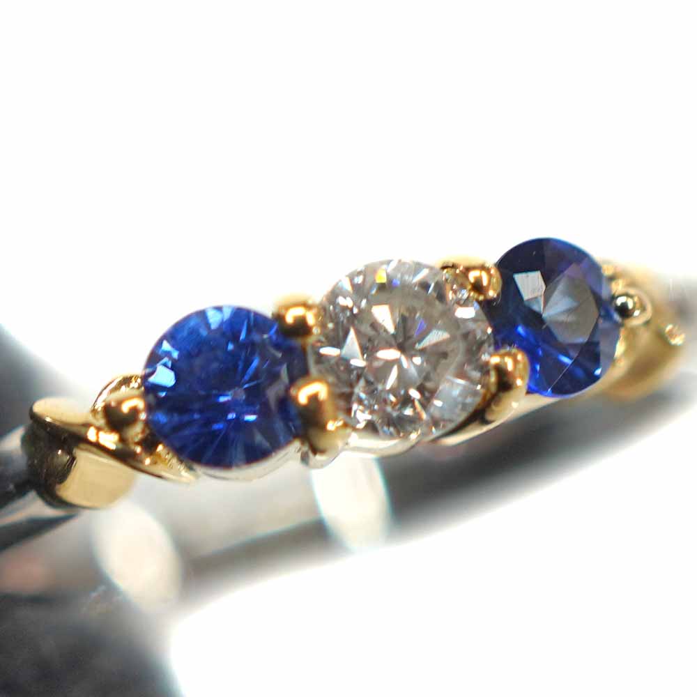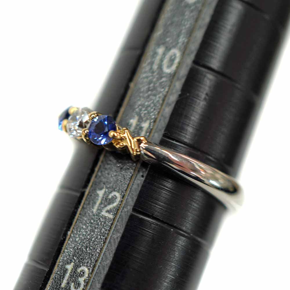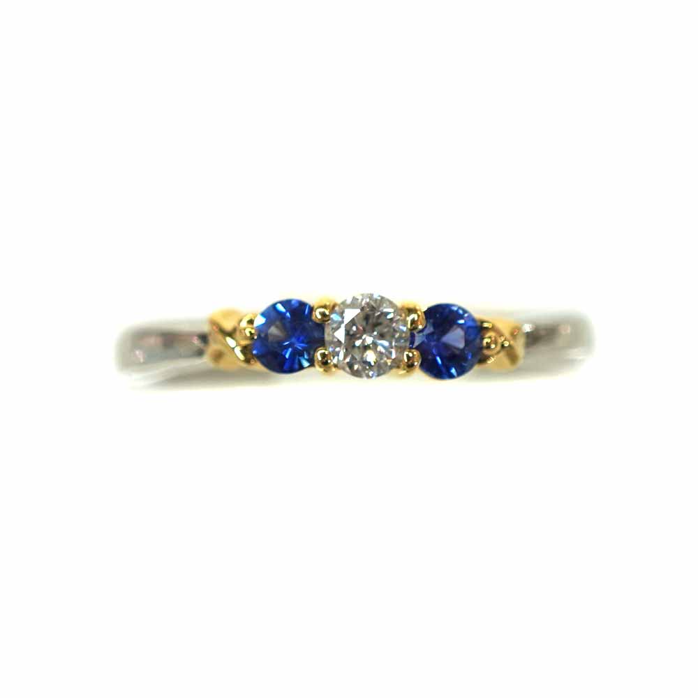 ゴールドとプラチナのコンビがゴージャスなアイテムです。 一粒のダイヤモンドと二粒のブルーサファイアがゴージャスで美しいリングです。 この機会に是非いかがでしょうか。