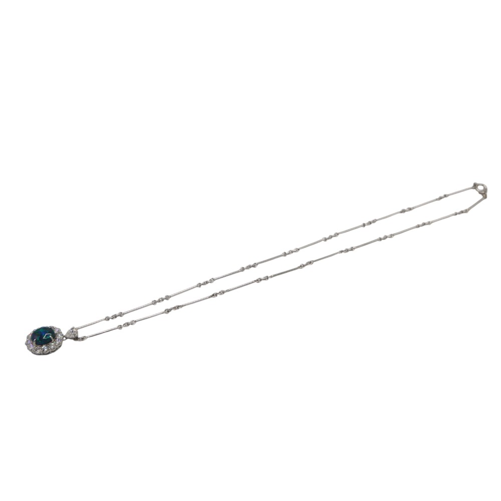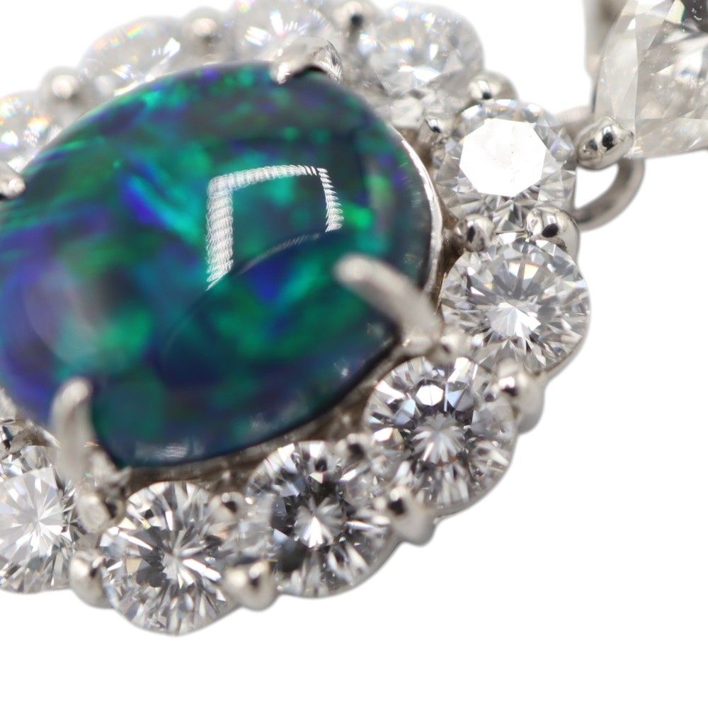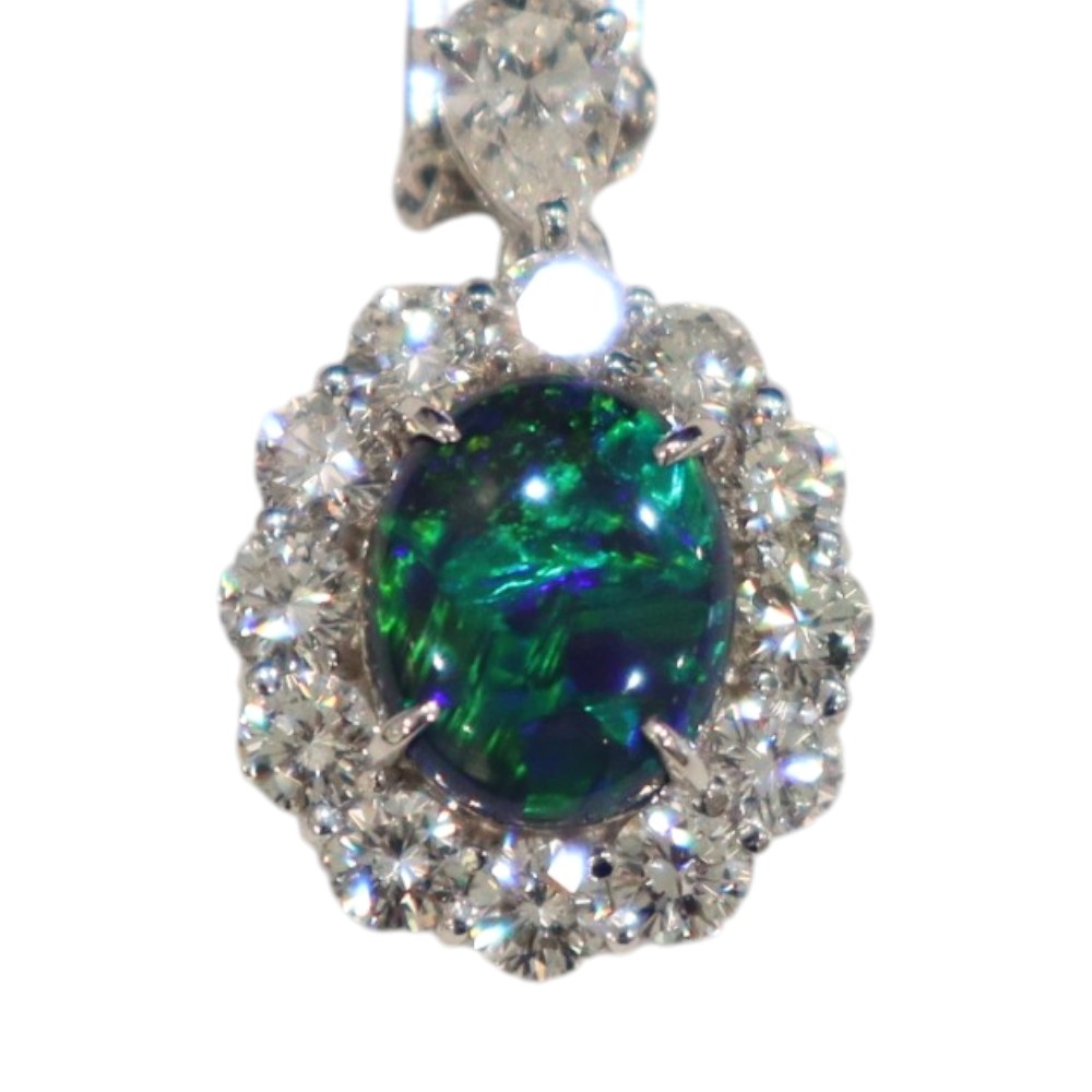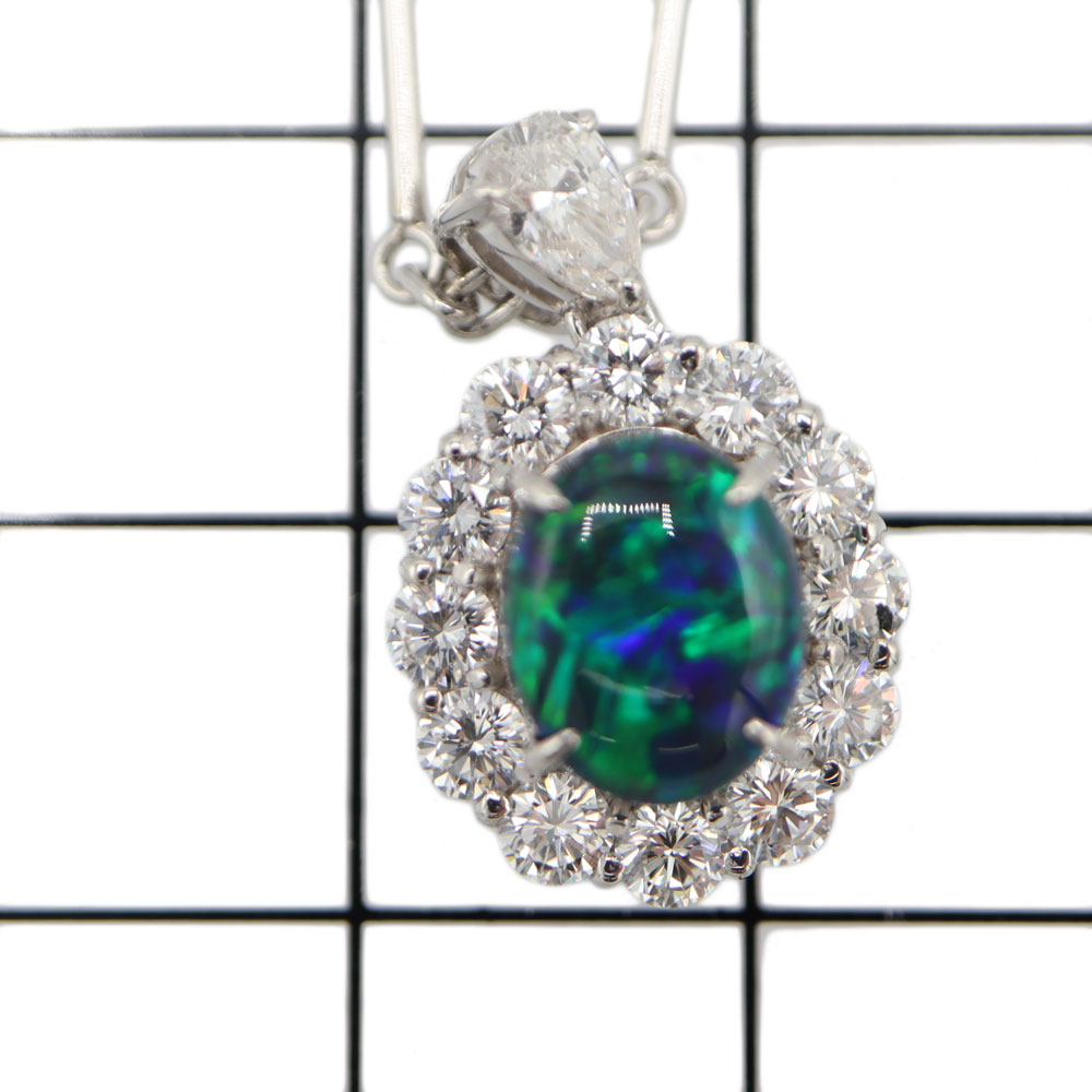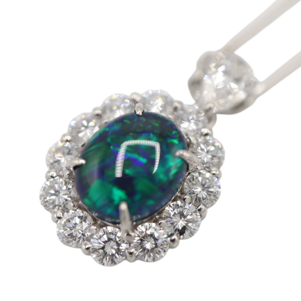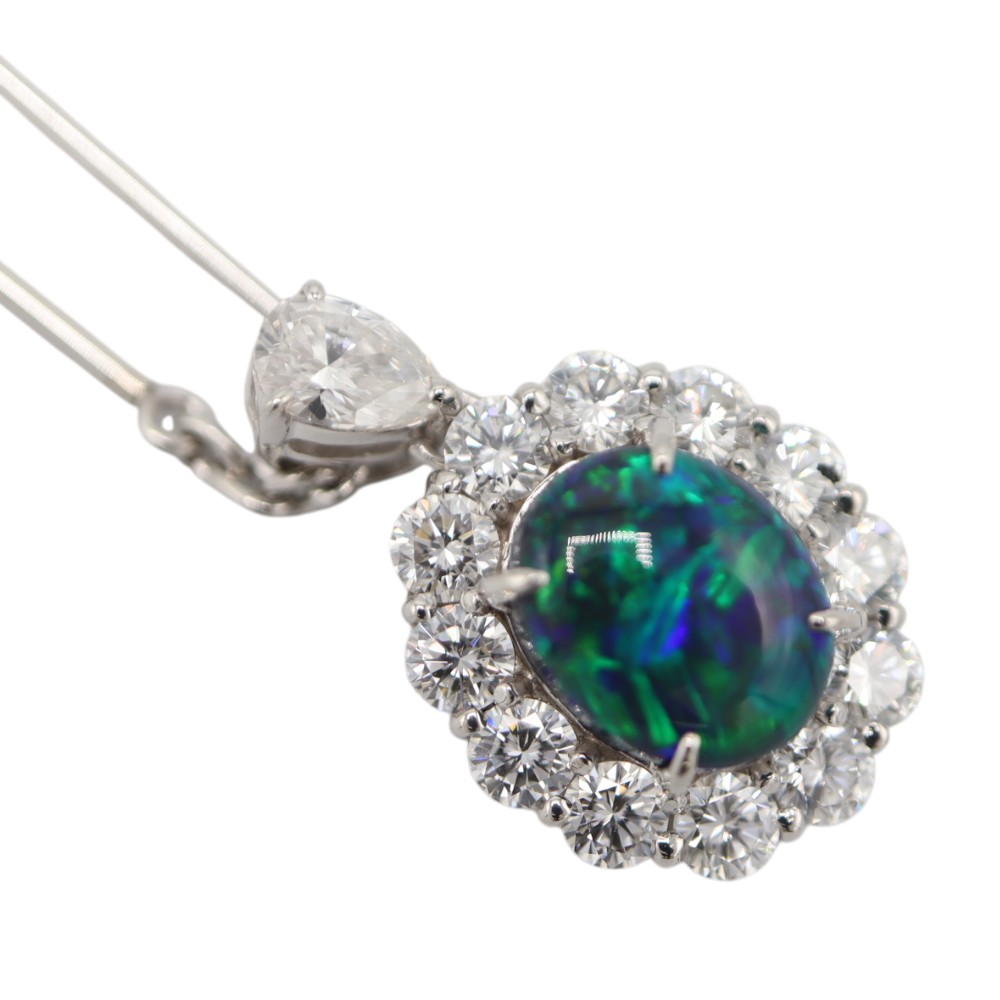 ブルー・グリーンのカラーが強く出ており神秘的な雰囲気のネックレスです。 ブラックオパールを囲むようにセットされたダイヤモンドは一粒一粒が眩く輝き、華やかなシーンでもひと際注目を集めます。