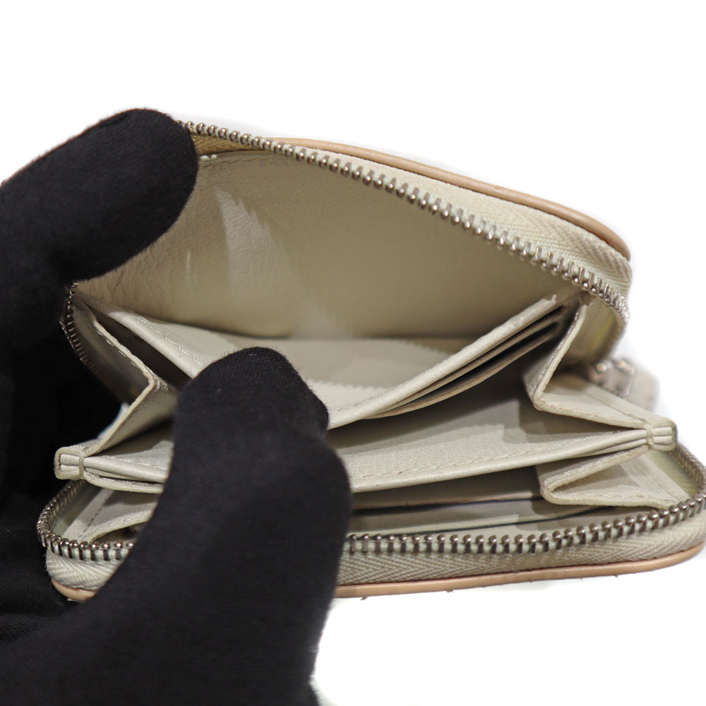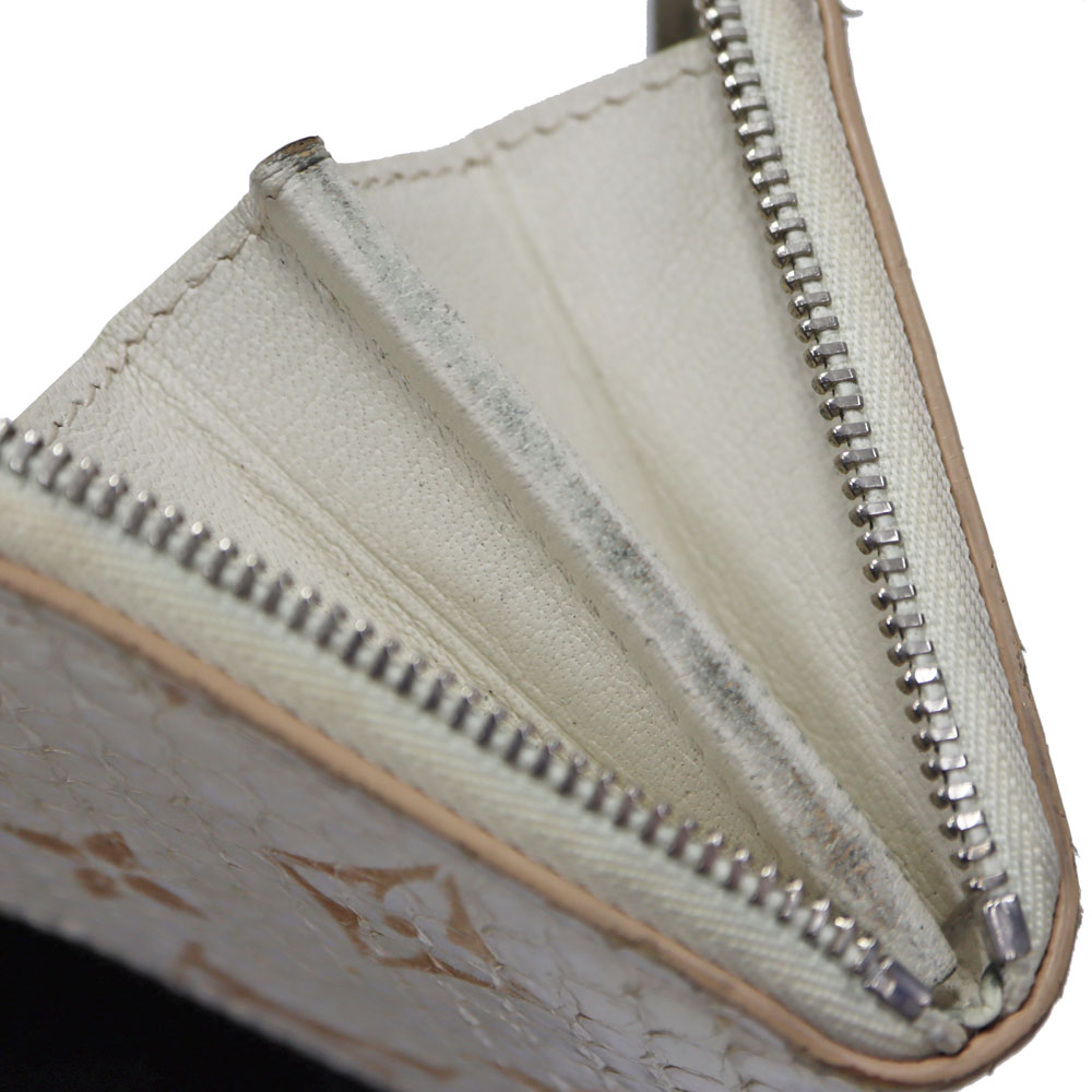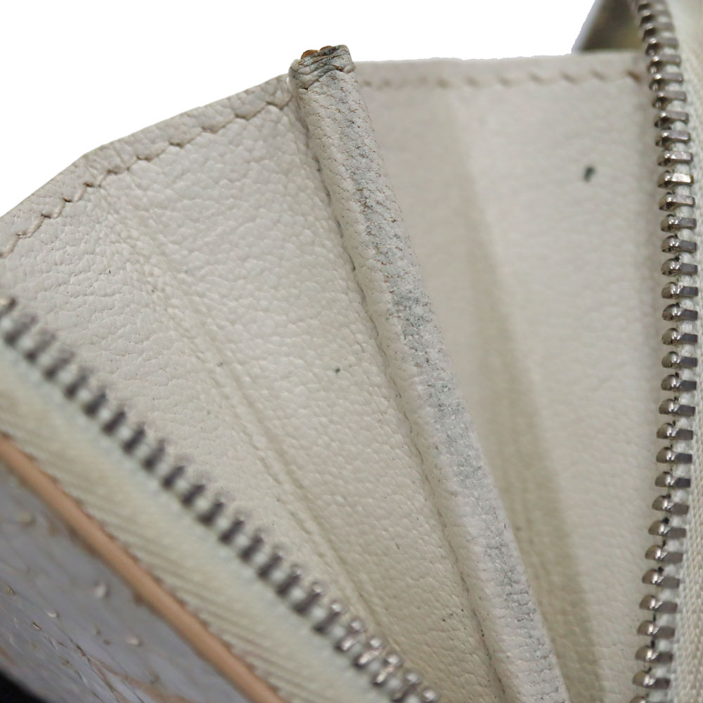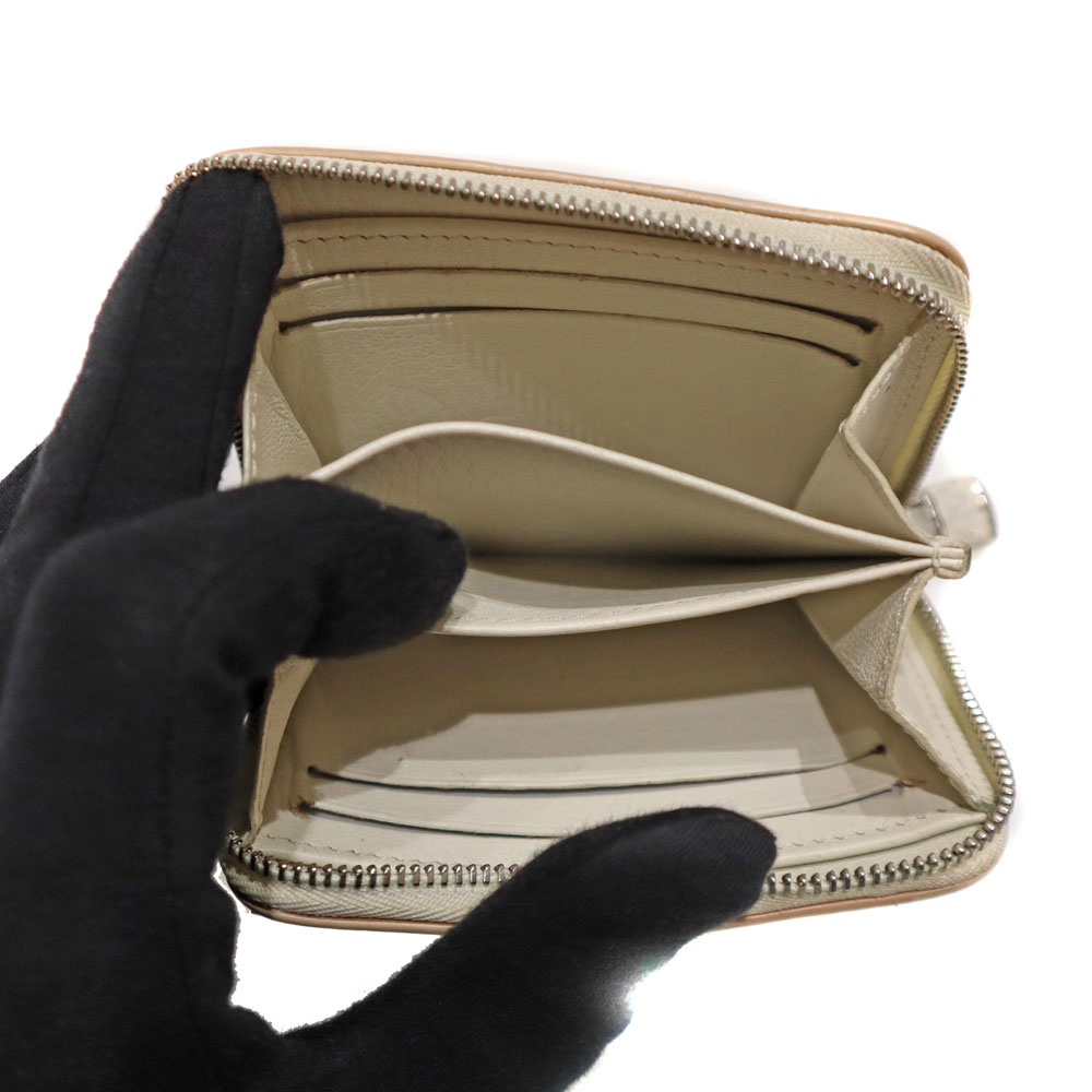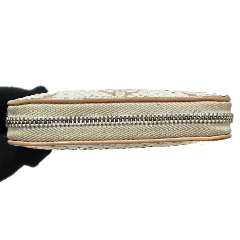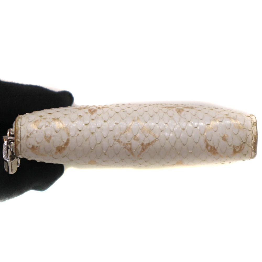 高級感あふれるエキゾチックレザーのパイソン(蛇革)を使用。 ホワイト系とシルバー金具の組み合わせが上品さを演出したデザインです。 サイズはコンパクトながら、カード入れやオープンポケットが合計9か所あり、お札も折って収納可能です。 大きく開くラウンドファスナー開閉式のため、中身の出し入れもスムーズです。 キャッシュレスのご時世に合った、機能的で上品なアイテムとなっております。