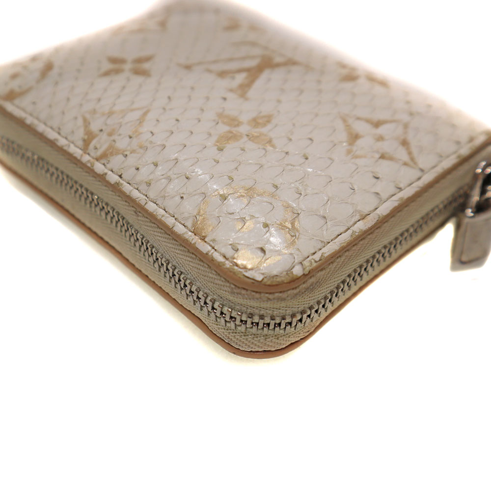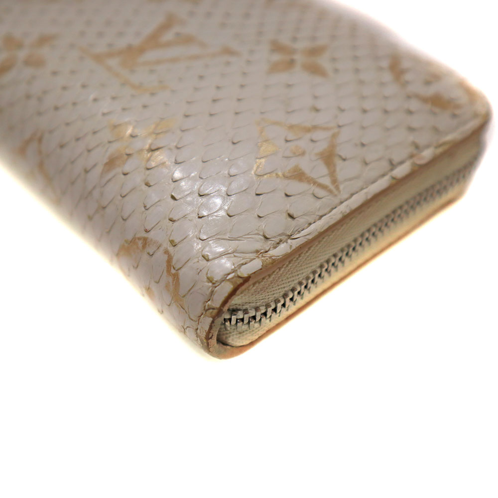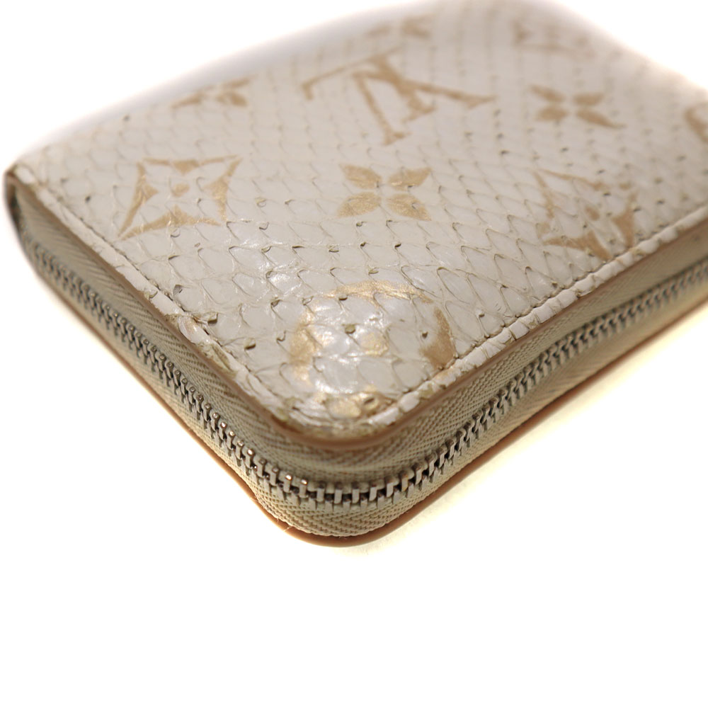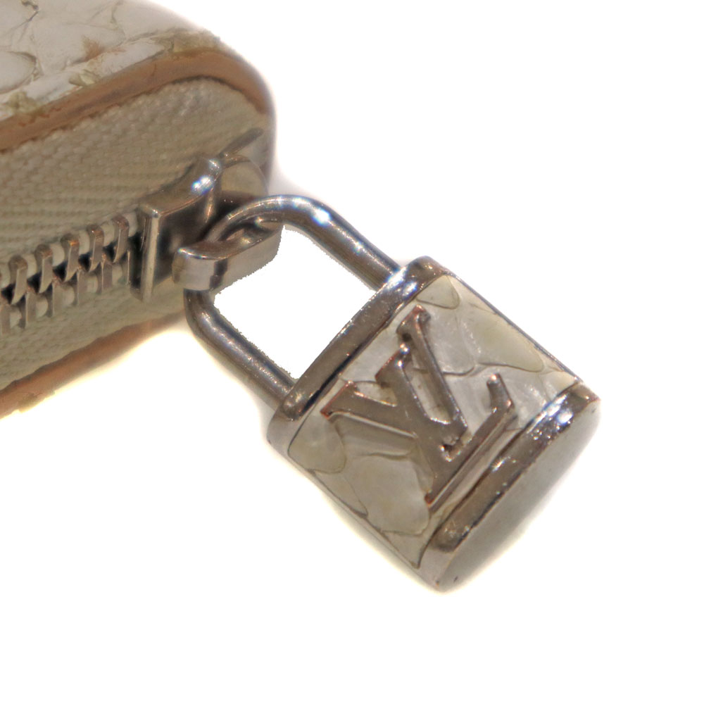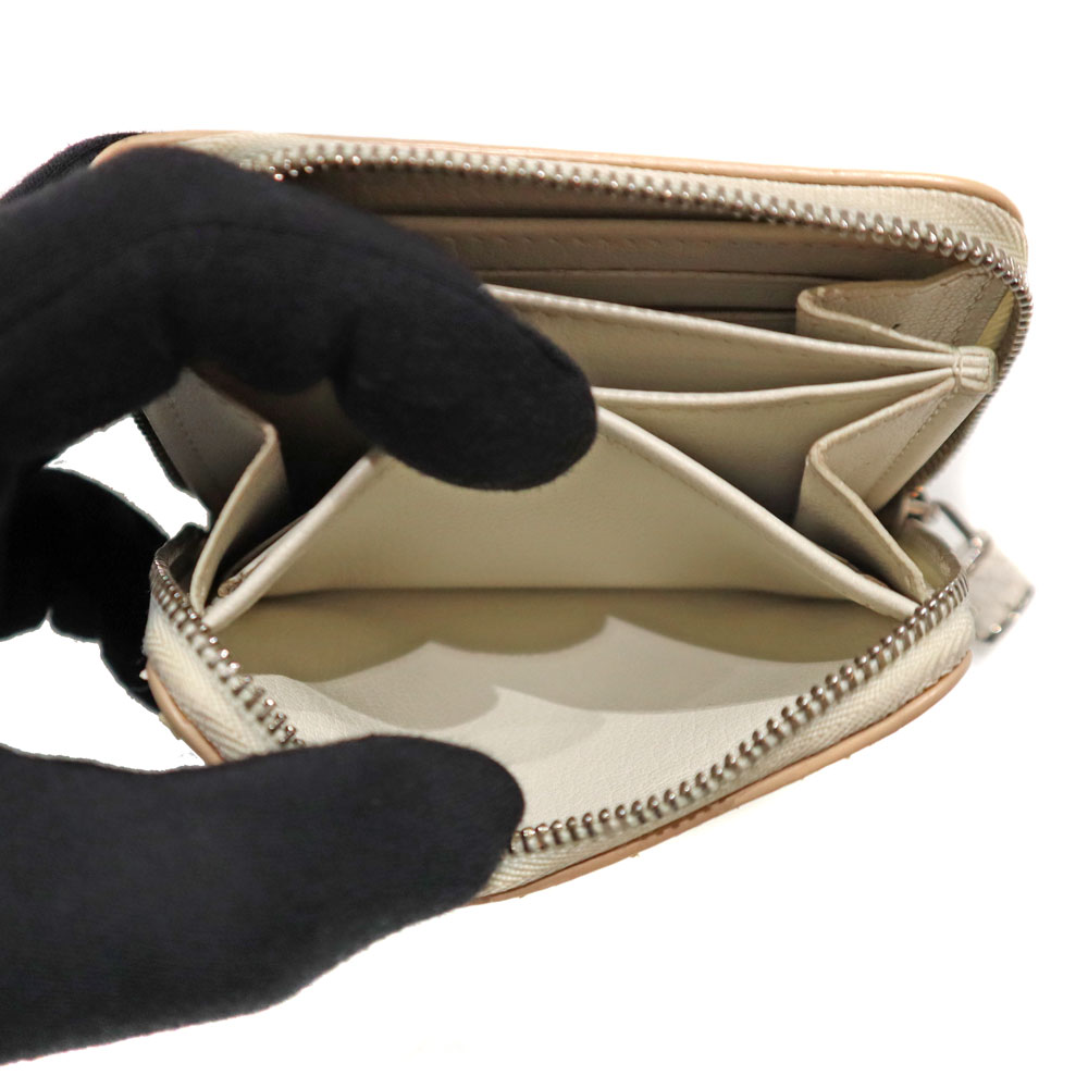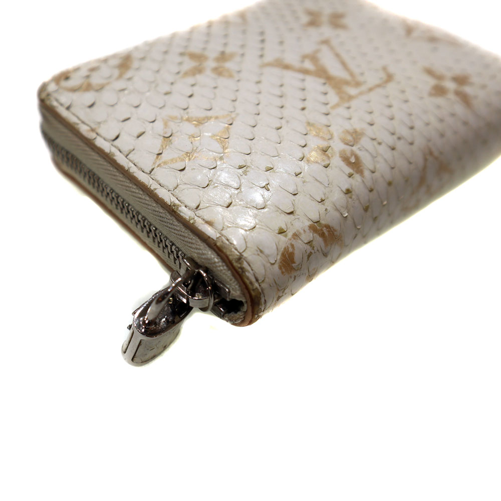 高級感あふれるエキゾチックレザーのパイソン(蛇革)を使用。 ホワイト系とシルバー金具の組み合わせが上品さを演出したデザインです。 サイズはコンパクトながら、カード入れやオープンポケットが合計9か所あり、お札も折って収納可能です。 大きく開くラウンドファスナー開閉式のため、中身の出し入れもスムーズです。 キャッシュレスのご時世に合った、機能的で上品なアイテムとなっております。