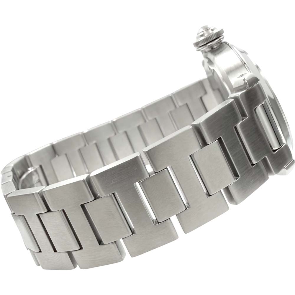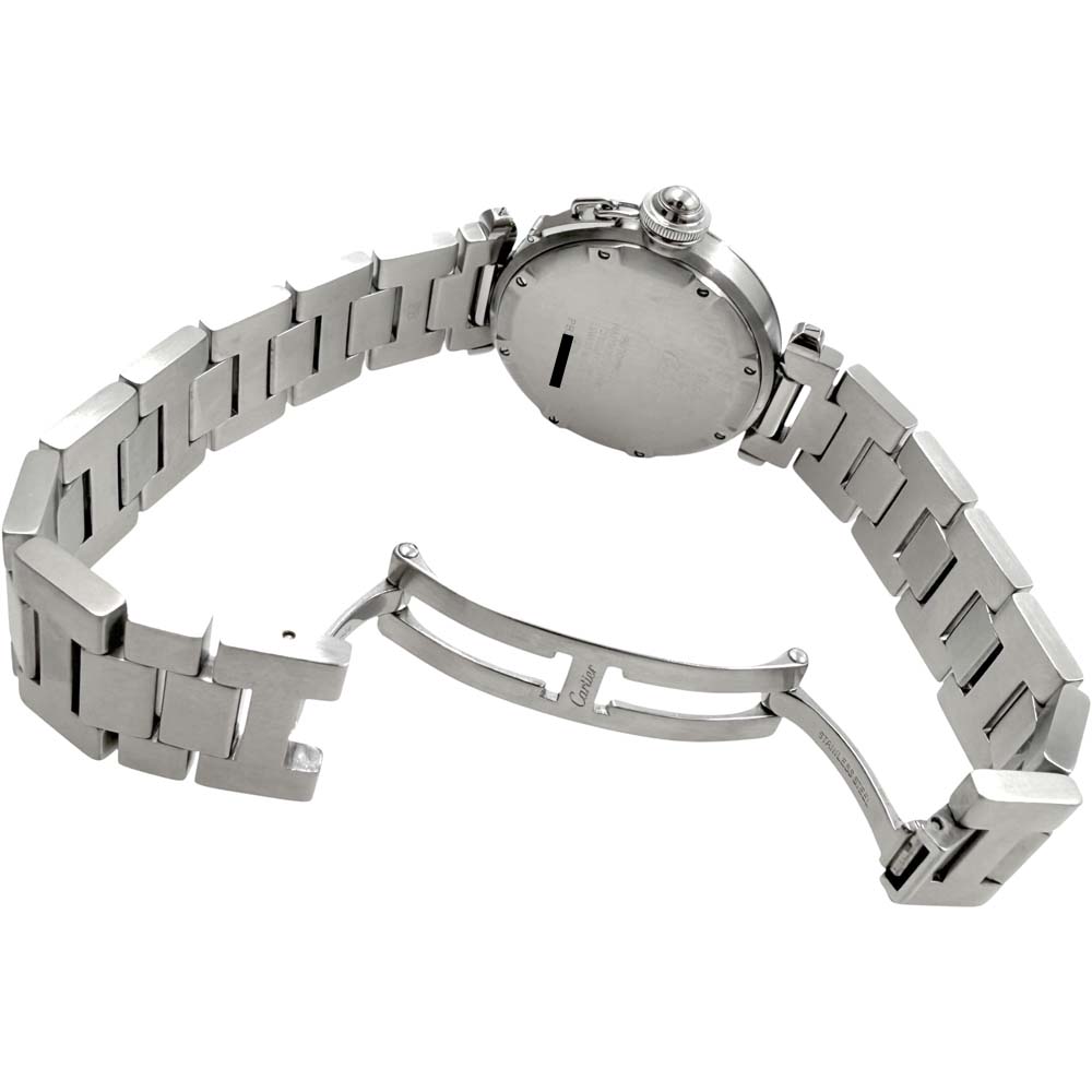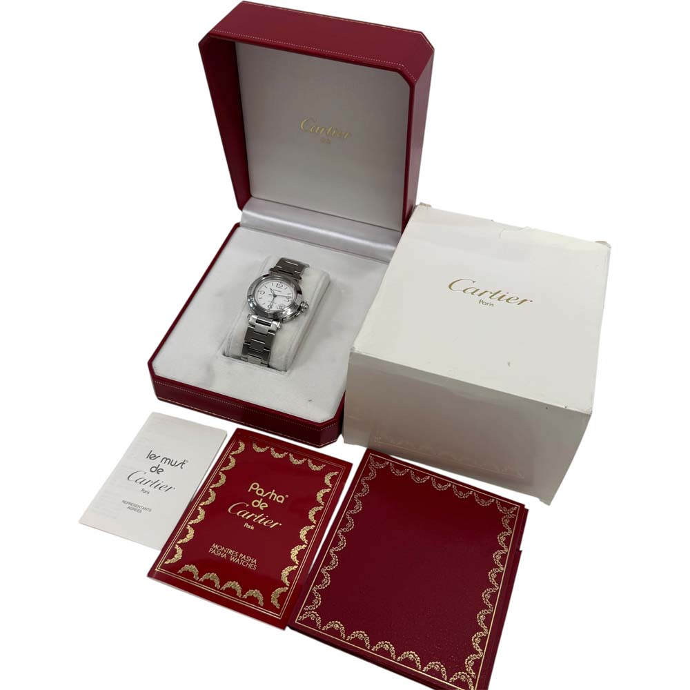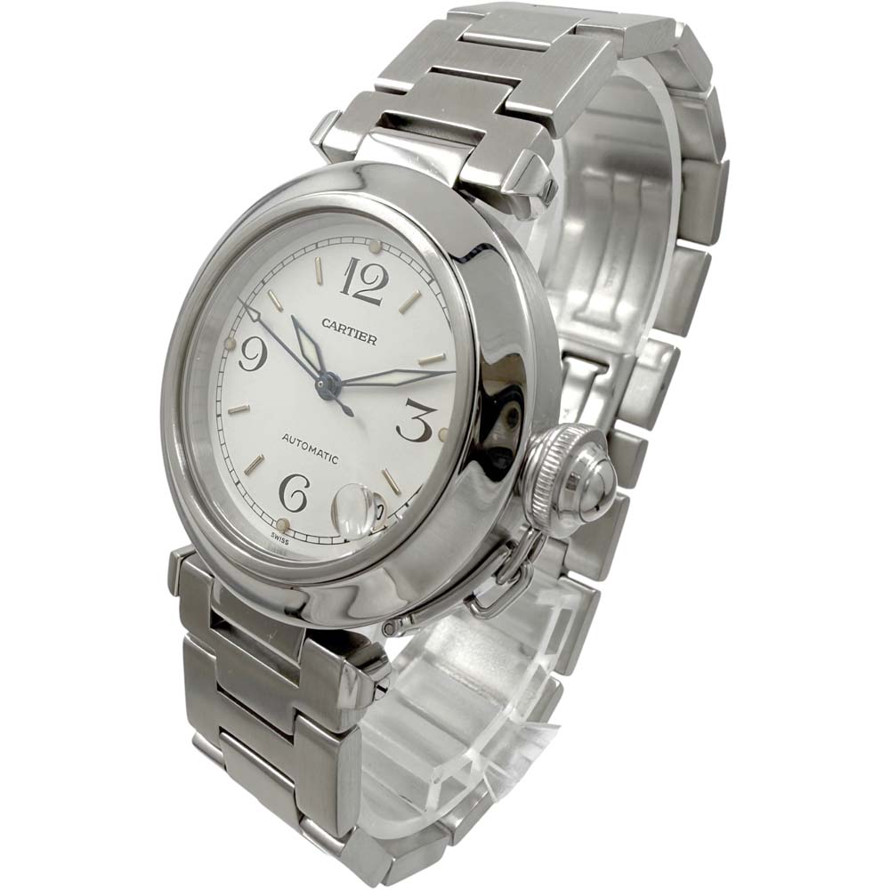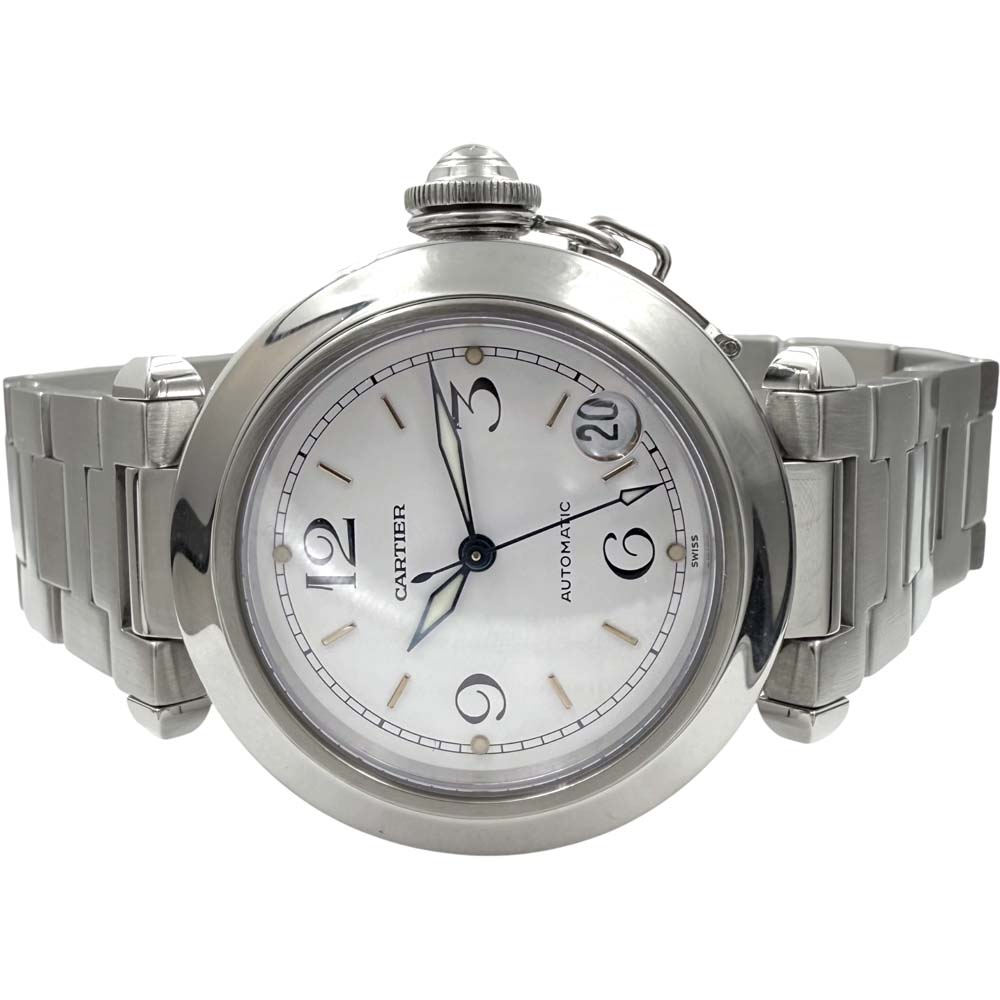 | 商品説明 | カルティエの「パシャC デイト」モデルW31015M7は、ステンレススチール製のケースとブレスレットを備えた機械式腕時計です。リューズガードとゴールドのバーインデックスがデザインの特徴です。また、ホワイトの文字盤には日付表示機能があり、視認性が高く、シンプルでエレガントな仕上がりとなっています。