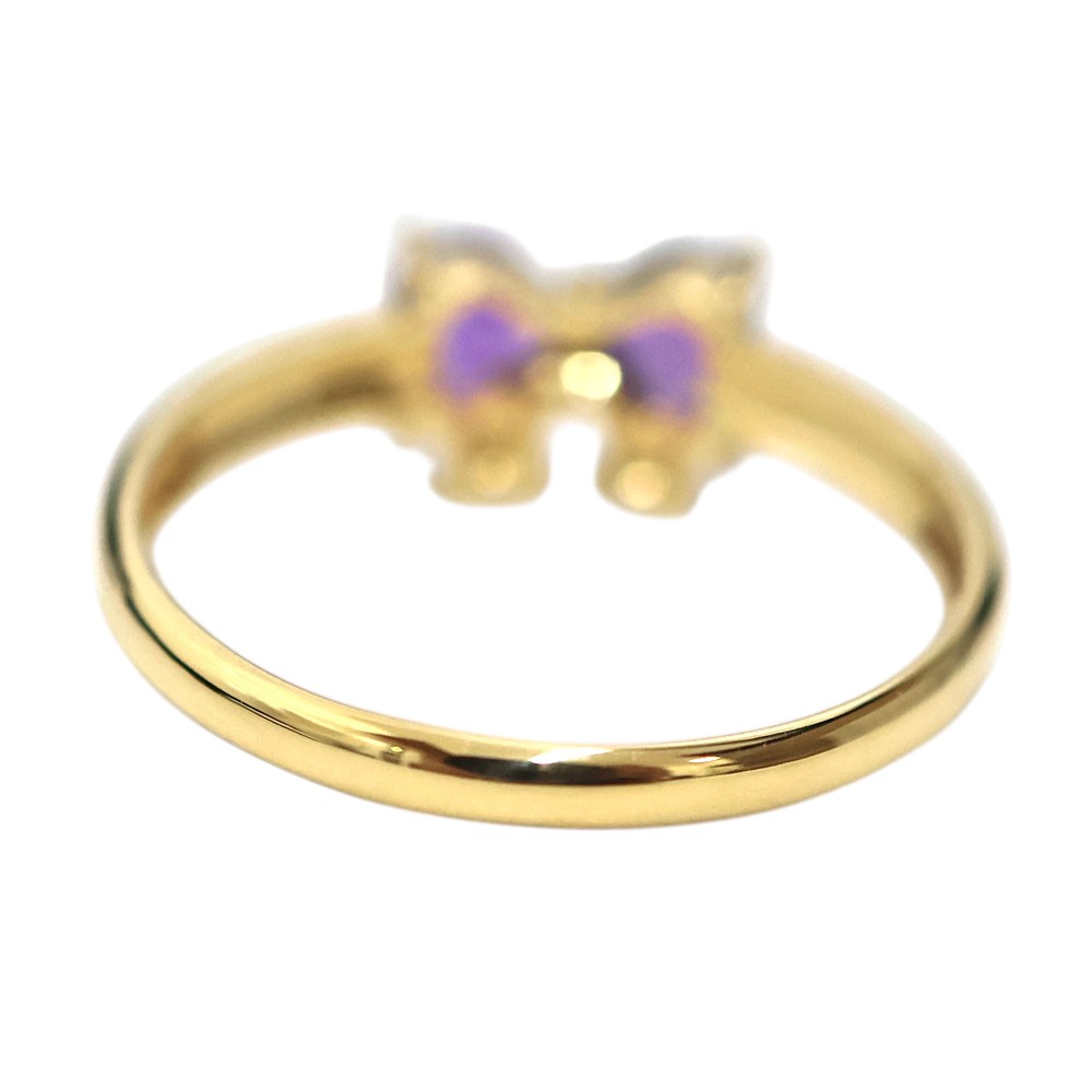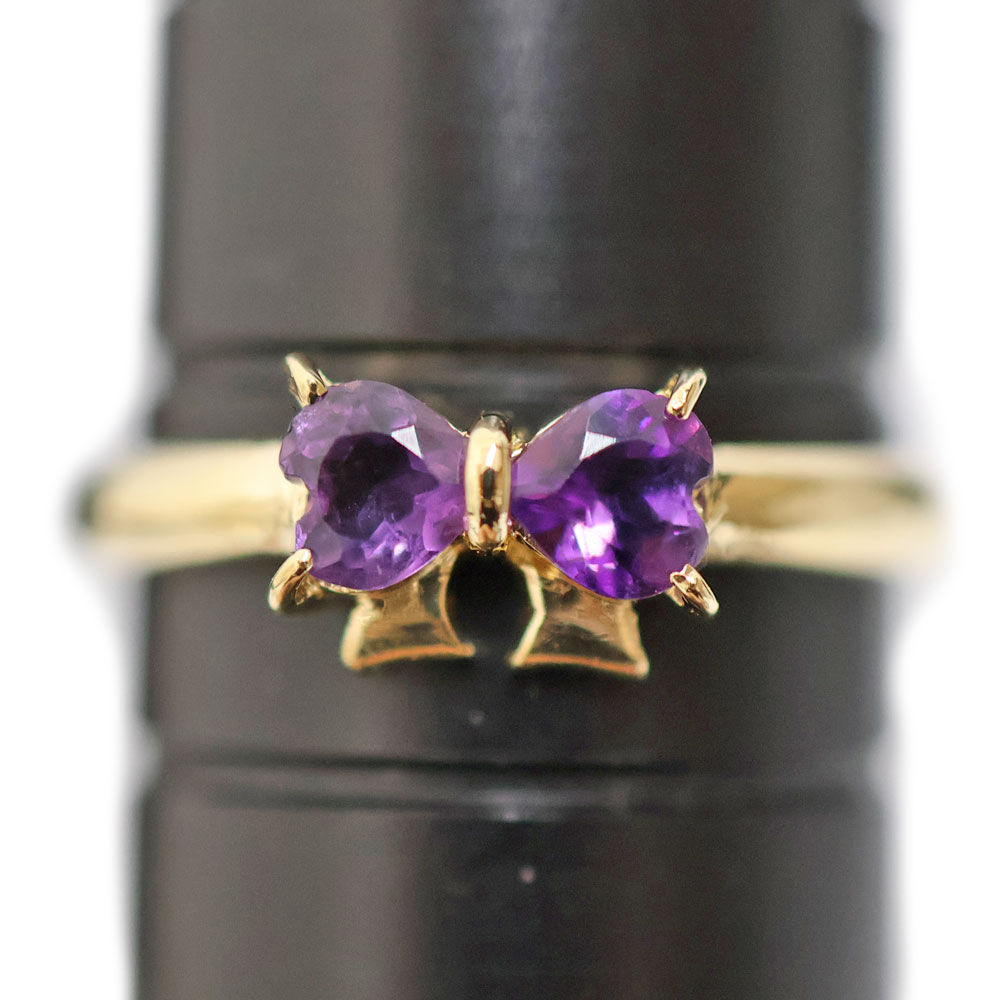 中央には美しくカットされた2石のアメシストが並び、リボンのような可憐なデザインに仕上げられています。 深みのある紫色が指元に華やかさと気品を添え、シンプルながらも印象的な輝きを放ちます。 この機会にぜひいかがでしょうか。