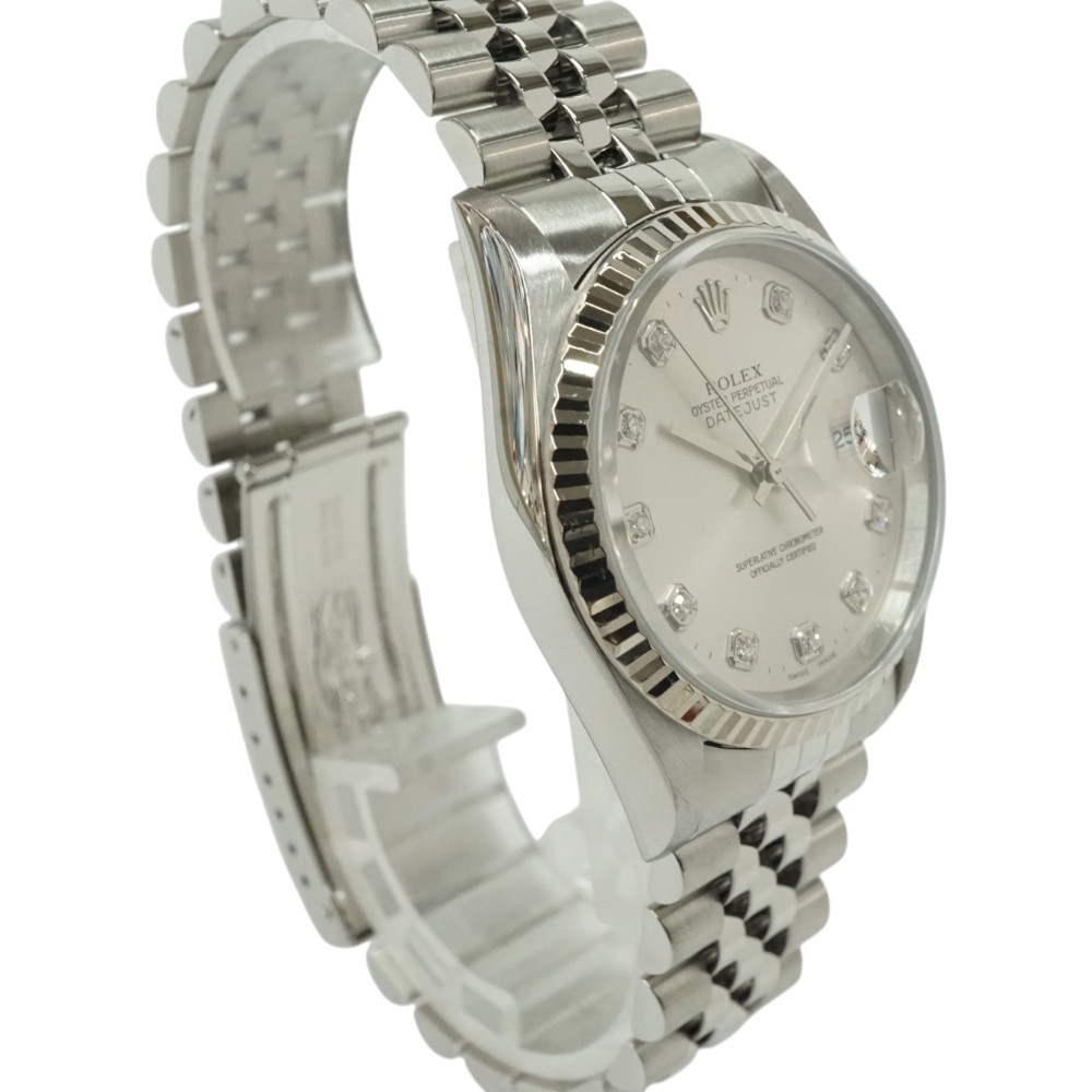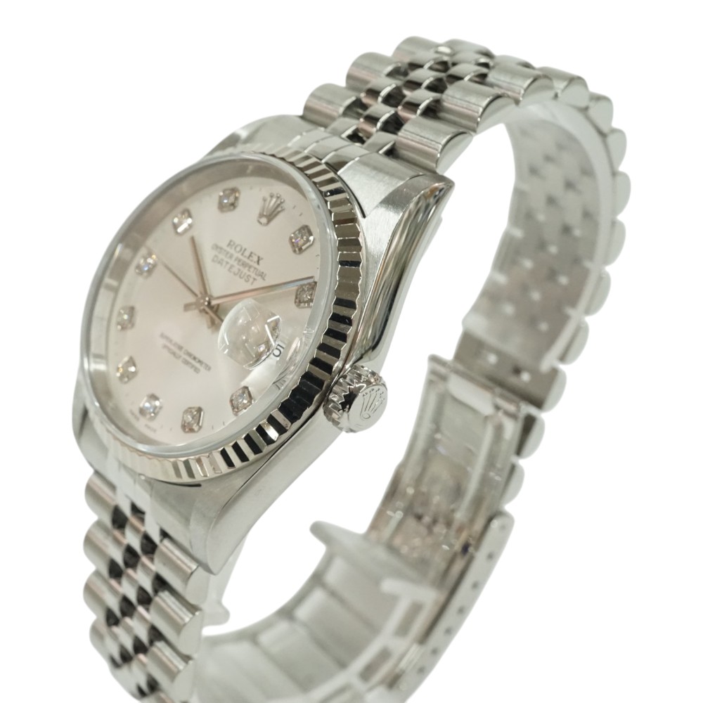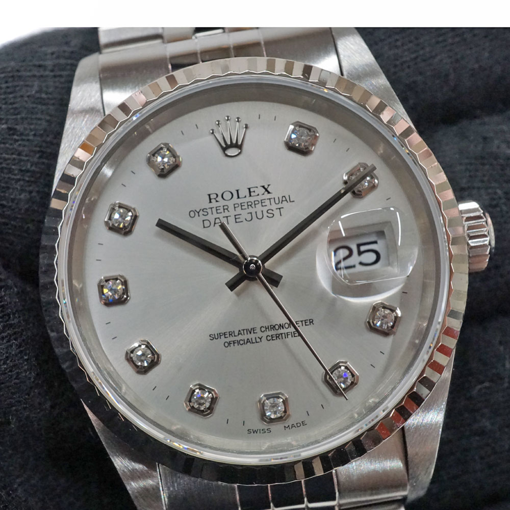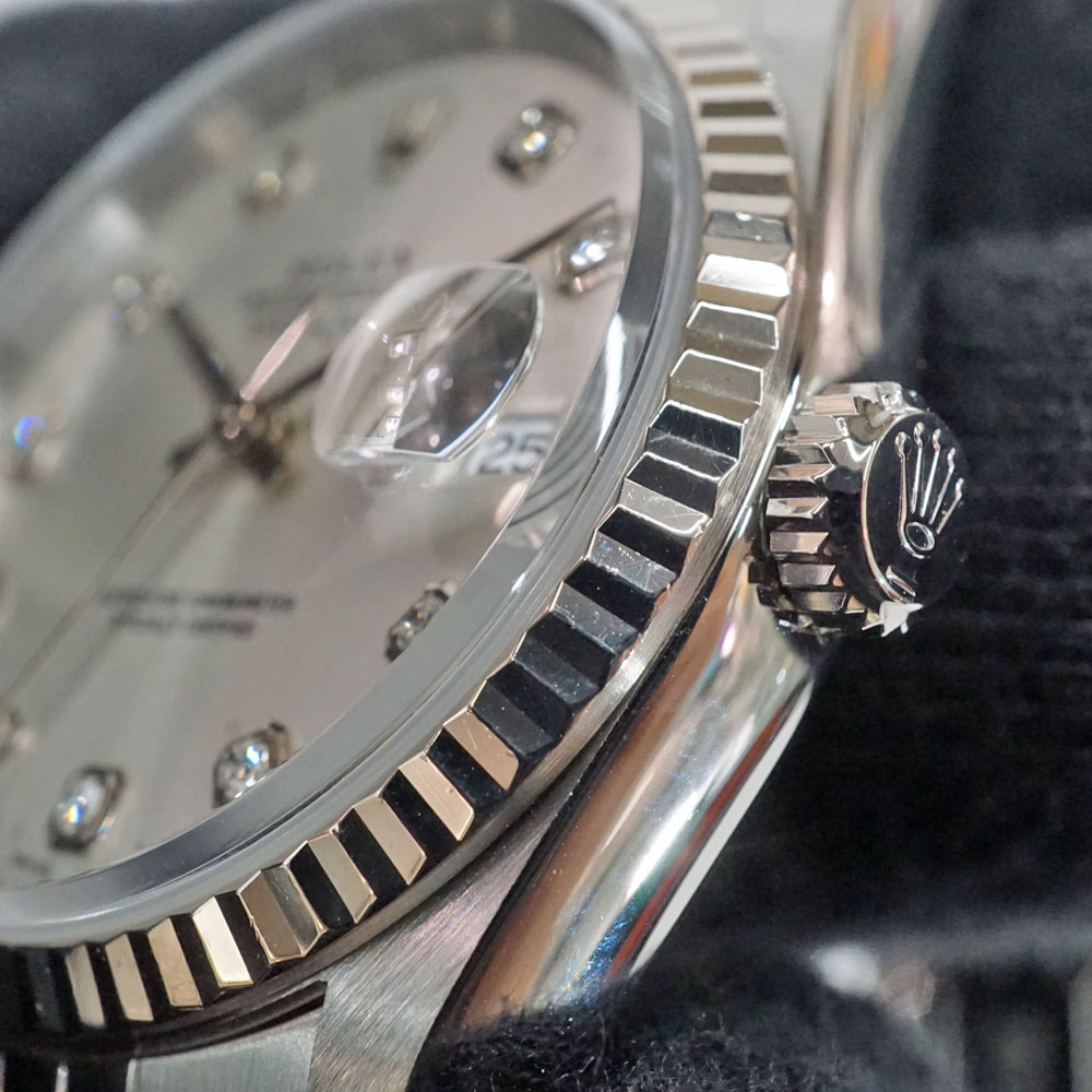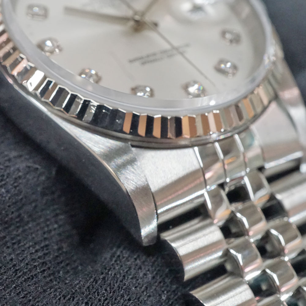 | 素材 | ケース:ステンレス×ホワイトゴール ブレス:SS(ステンレススチール) ベゼル:フルーテッドベゼル ダイヤル:シルバー+10Pダイヤ ガラス:サファイアクリスタル |
