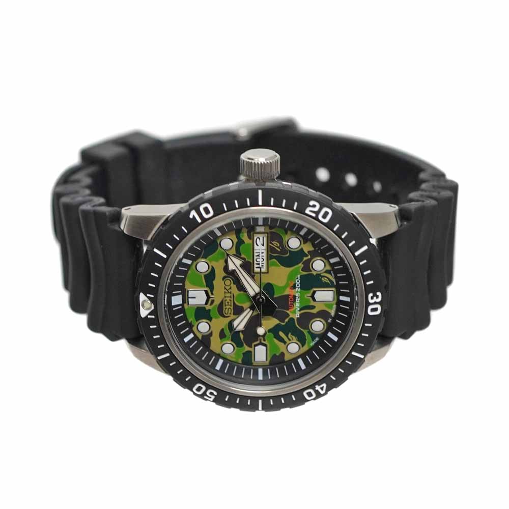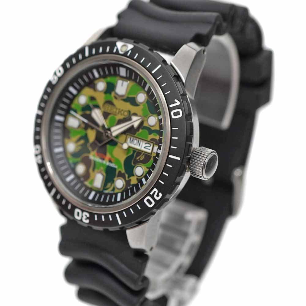 セイコーのメカニカルダイバーズ BAPEコラボが入荷しました。 セイコーとア ベイシング エイプがコラボしたダイバーズウォッチです。 BAPEオリジナルカモフラージュ柄の1ST CAMOをあしらった文字盤と、ダイバーズウォッチならではのポリウレタンバンドという、重厚感のある組み合わせのデザインが特徴的です。 また200m防水機能や日付、曜日表示機能等、日常使いにぴったりな機能を兼ね備えているモデルとなっております。 お探しの方はこの機会にぜひいかがでしょうか。
