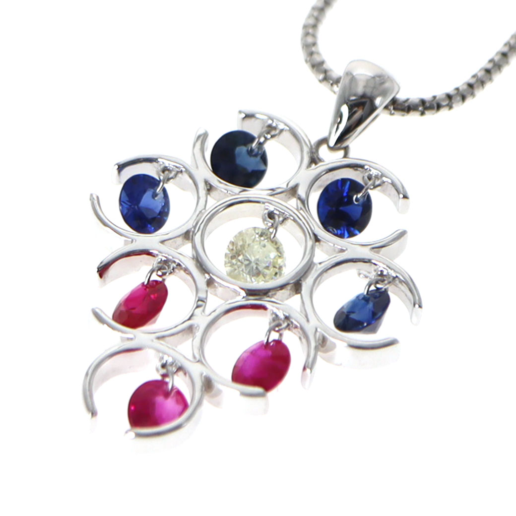 K18WG ホワイトゴールド ルビー サファイア ダイヤモンド ネックレス【中古】