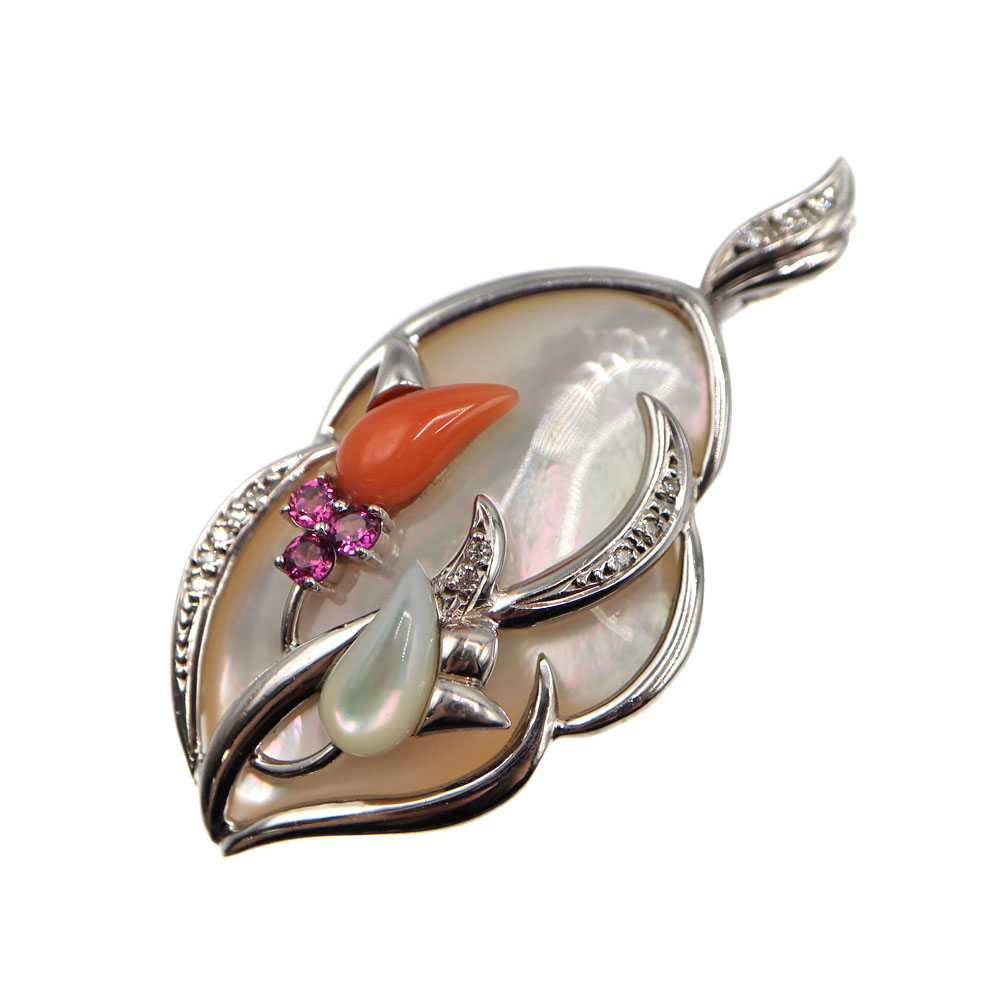 18金ホワイトゴールド K18WG サンゴ シェル ガーネット ペンダントトップ レディース シルバー【中古】