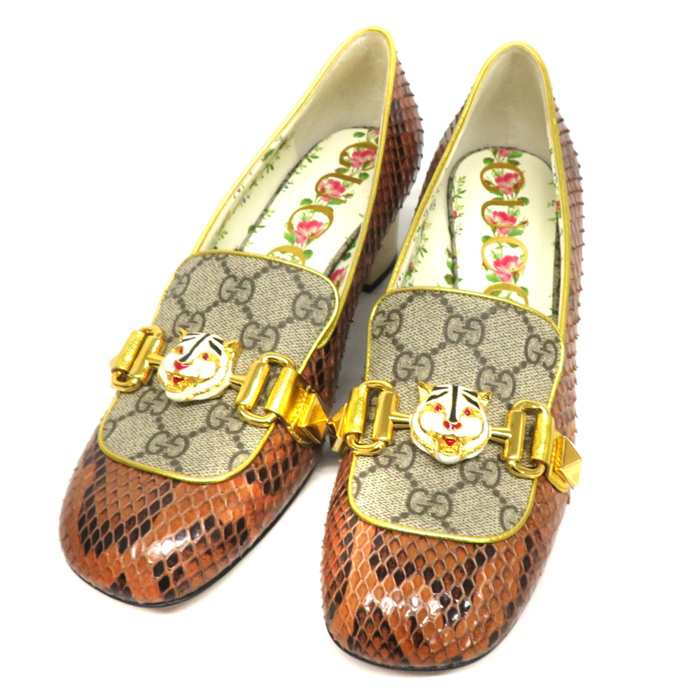 グッチ Gucci 498882 パンプス トラモチーフ パイソン ブラウン ゴールド【中古】