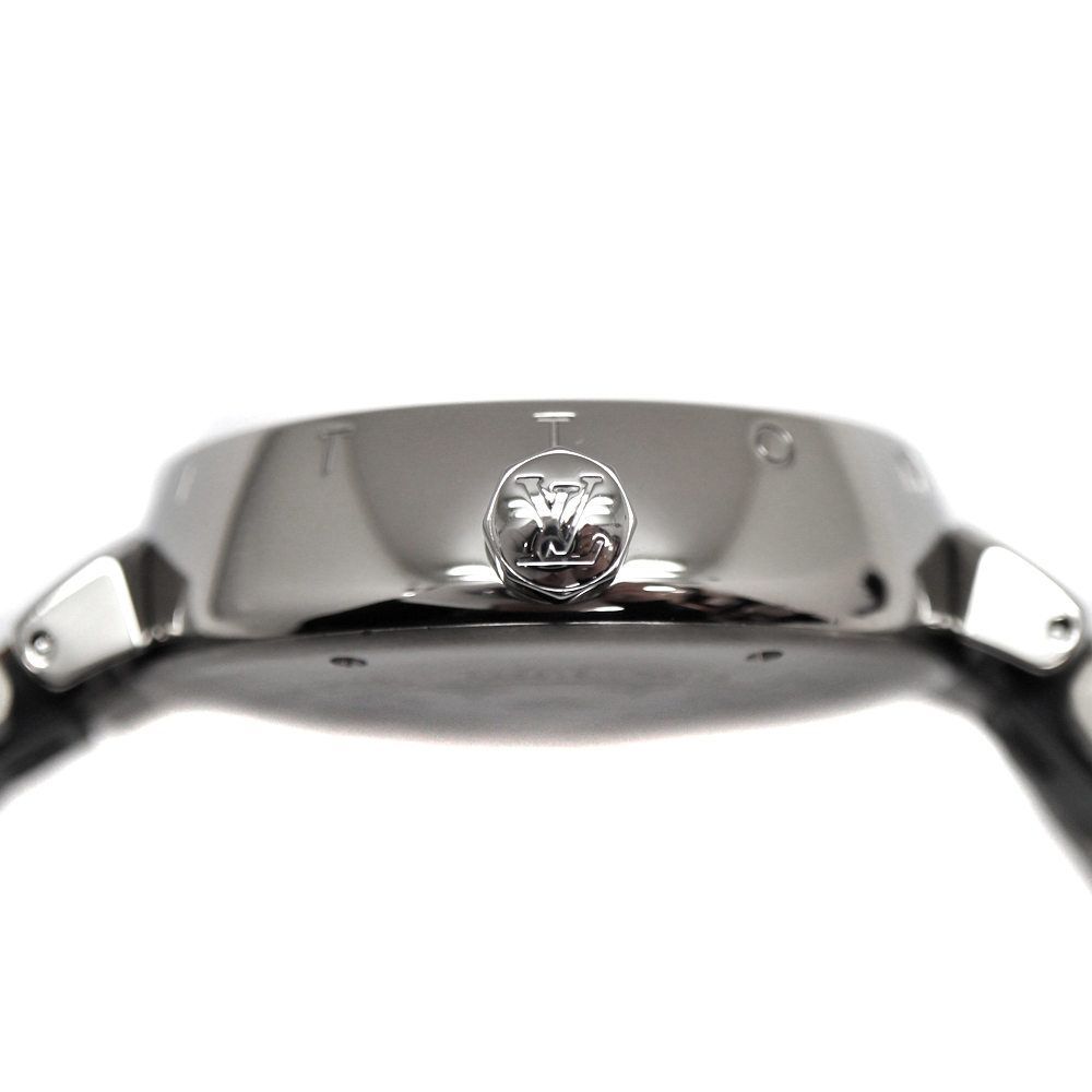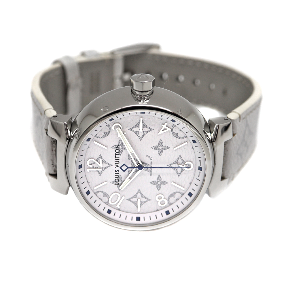 文字盤とベルトにはヴィトンの象徴であるモノグラムがデザインされており、ホワイトのベースにグレーのモノグラムがとてもお洒落です。