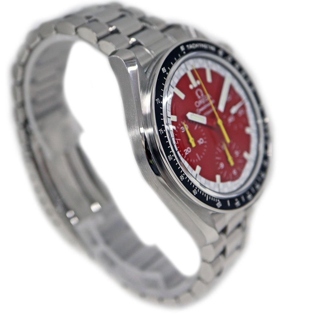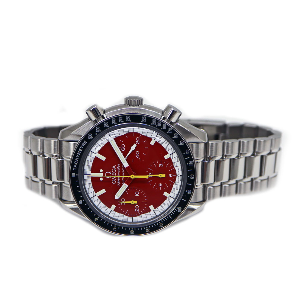 F1レーサーであるミハエルシューマッハとオメガが広告契約を結んだ記念として作られたモデルです。 文字盤の外側にはチェッカーフラグをデザインしており、赤色の文字盤と黄色いクロノグラフ針がとても目を引く一本です。