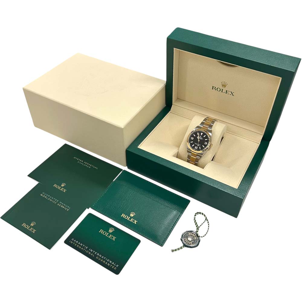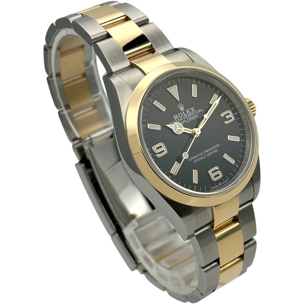 | 商品説明 | ロレックスのエクスプローラー36(Ref.124273)は、ステンレススチールとイエローゴールドのコンビネーションが特徴です。このモデルは耐久性に優れたオイスターケースを備え、シンプルで読みやすいブラックダイアルを持っています。高精度を誇る自動巻きムーブメントを搭載し、視認性を高めるために針とインデックスには夜光素材が施されています。防水性能に優れ、スポーツやアウトドアシーンにも適したデザインとなっています。