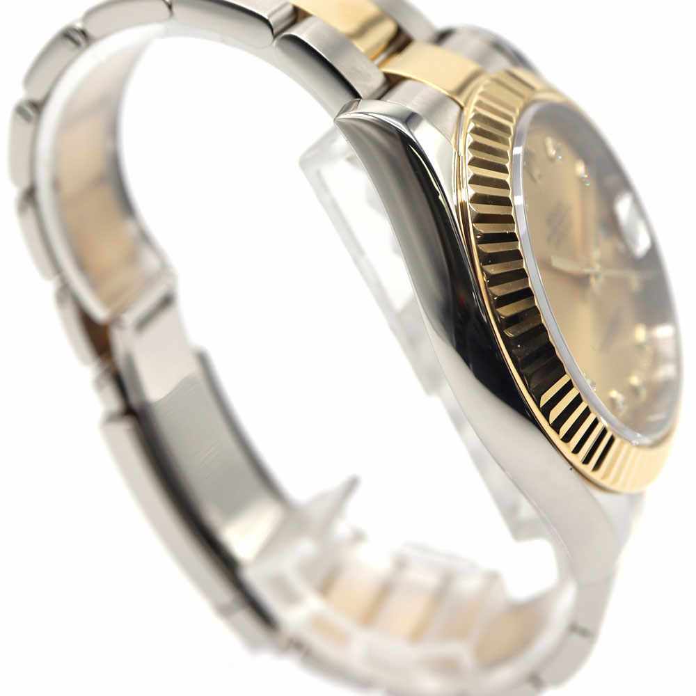美しいカッティングが施された18Kイエローゴールド製のフルーテッドベゼルを搭載しているこちらのアイテム。 シャンパンゴールドの文字盤に10Pダイヤのインデックスが高級感を醸し出しています。
