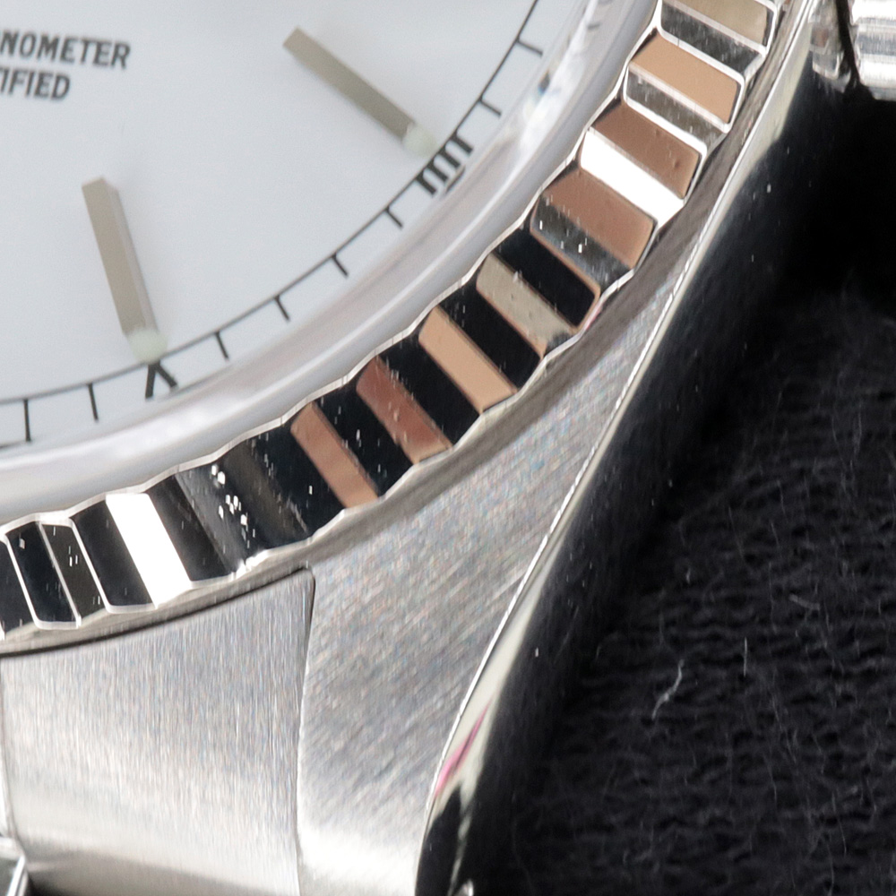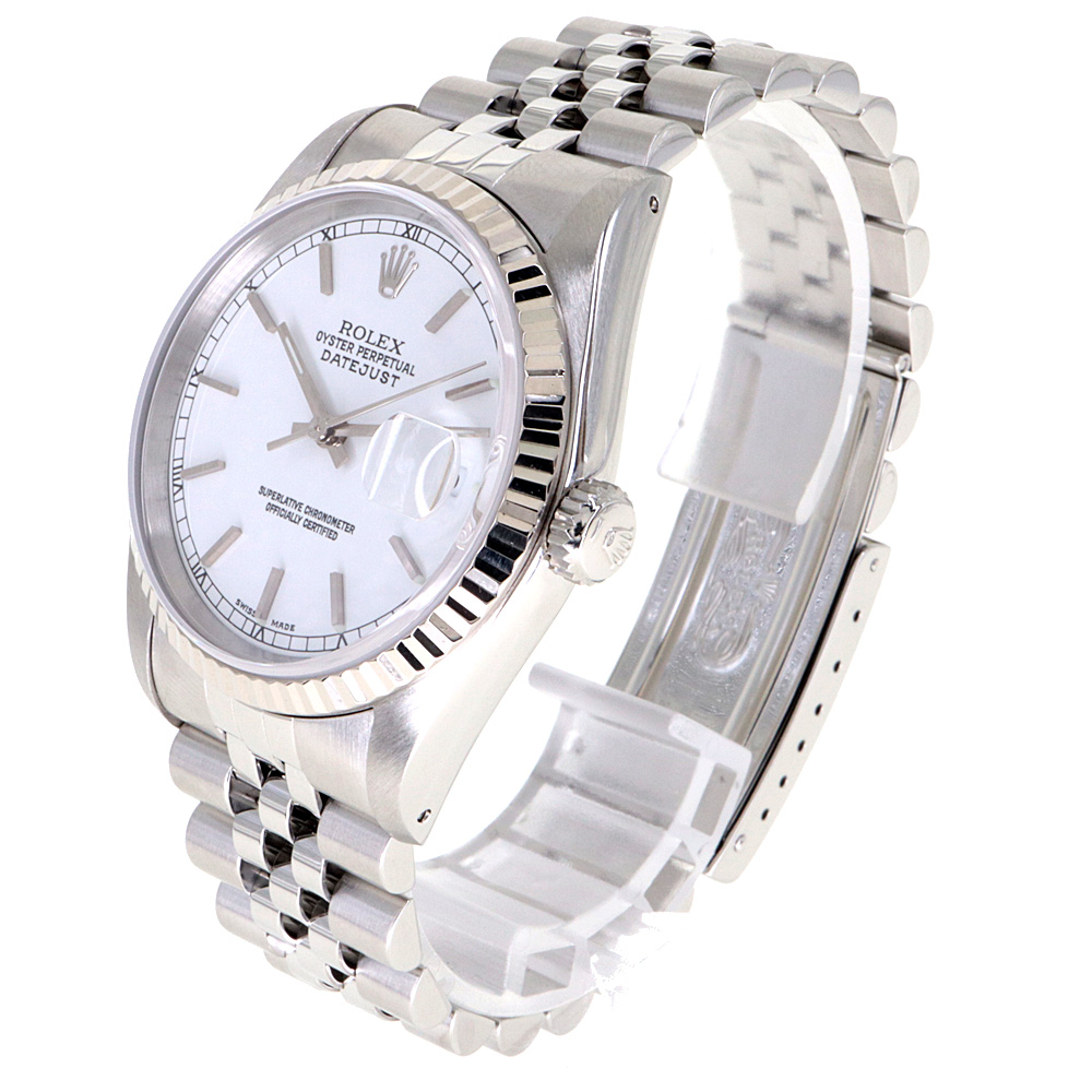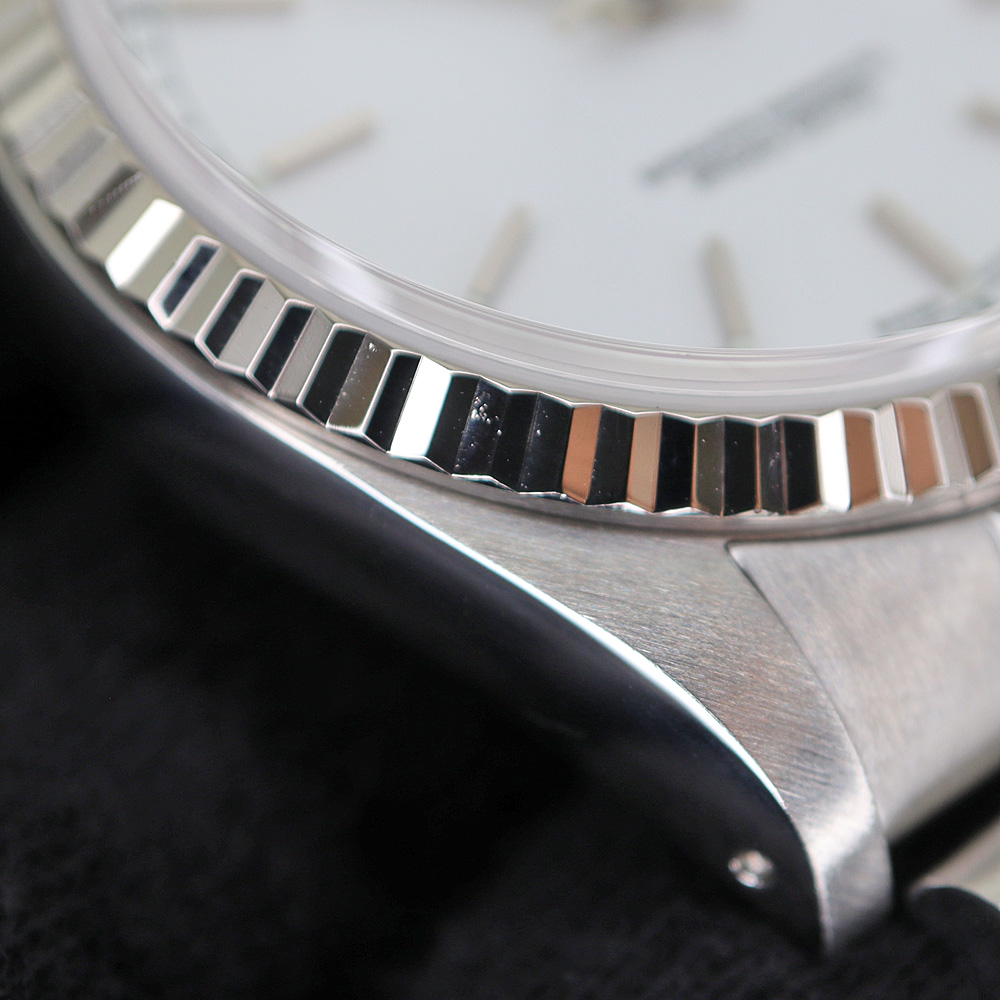 デイトジャストとは午前0時頃瞬時に日付が変わるデイトジャスト機構、 全回転式ローターを搭載したパーペチュアル機構、ロレックス三大機構を搭載したモデルです。 ホワイト文字盤ですので飽きも来ず末永くお使いいただけます。 この機会に是非いかがでしょうか。