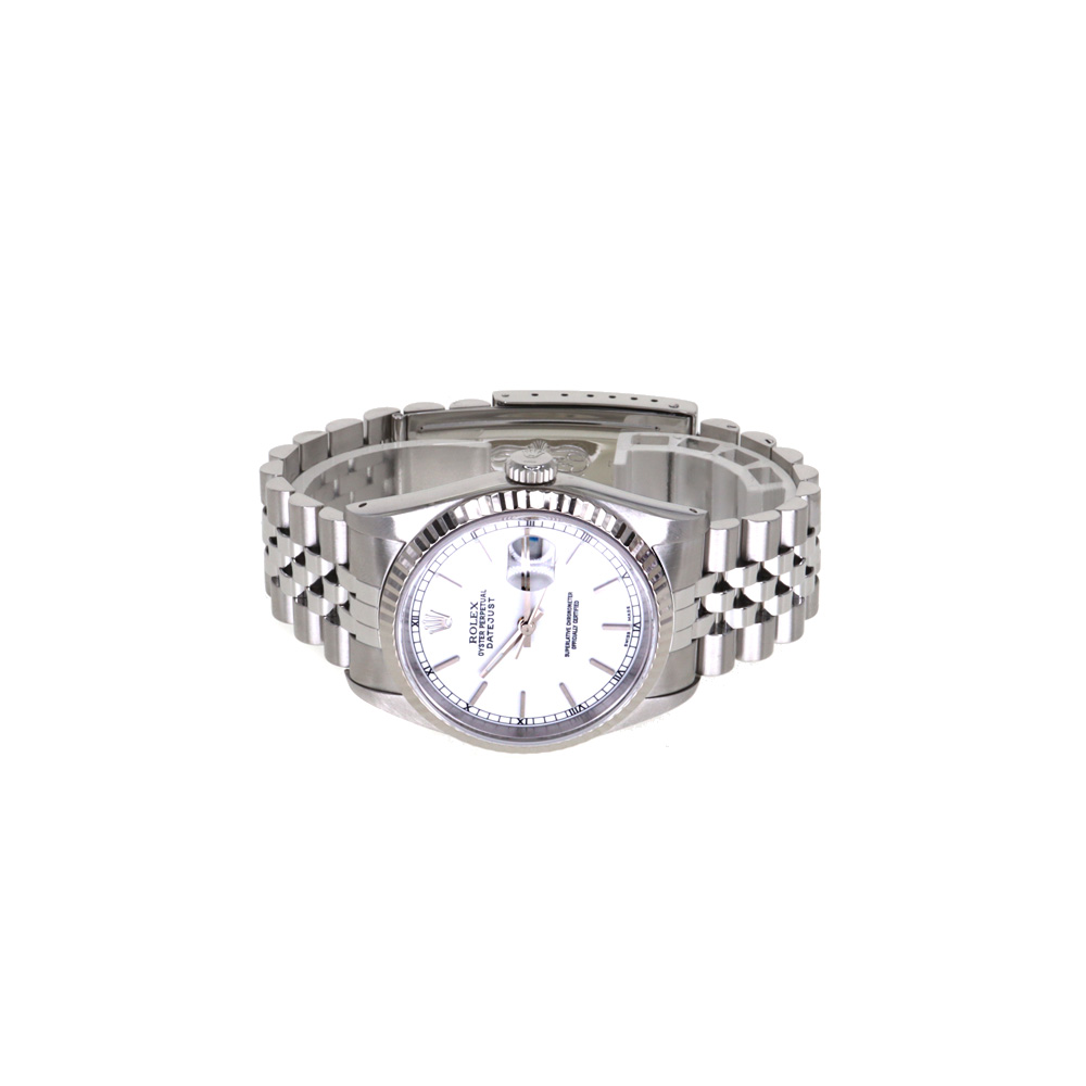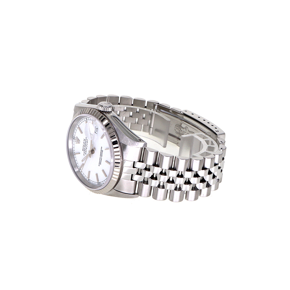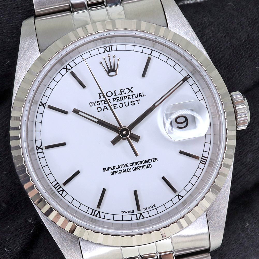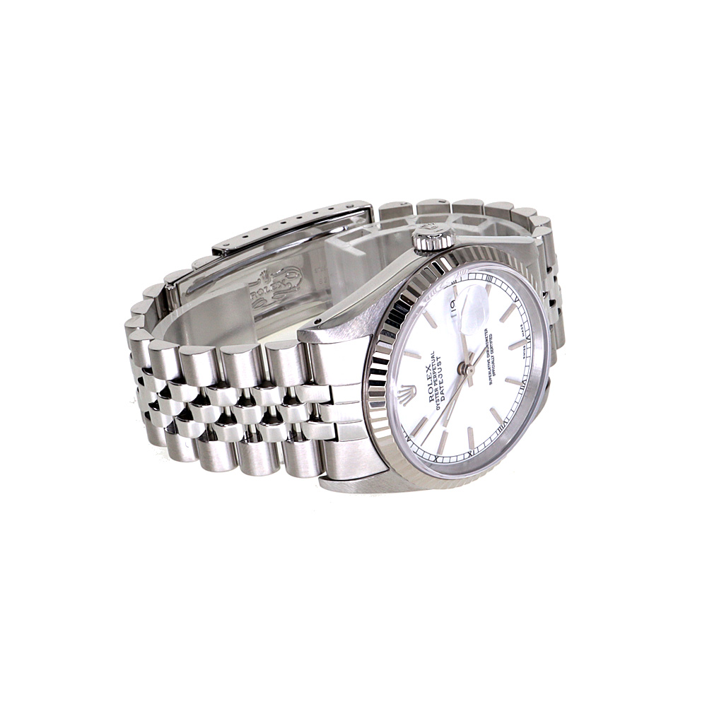 デイトジャストとは午前0時頃瞬時に日付が変わるデイトジャスト機構、 全回転式ローターを搭載したパーペチュアル機構、ロレックス三大機構を搭載したモデルです。 ホワイト文字盤ですので飽きも来ず末永くお使いいただけます。 この機会に是非いかがでしょうか。