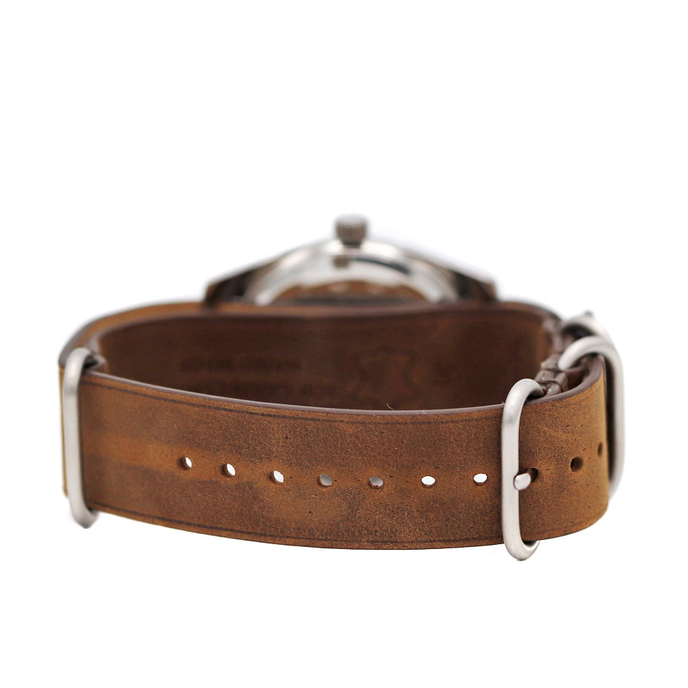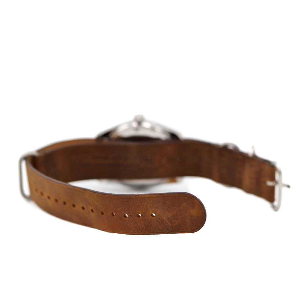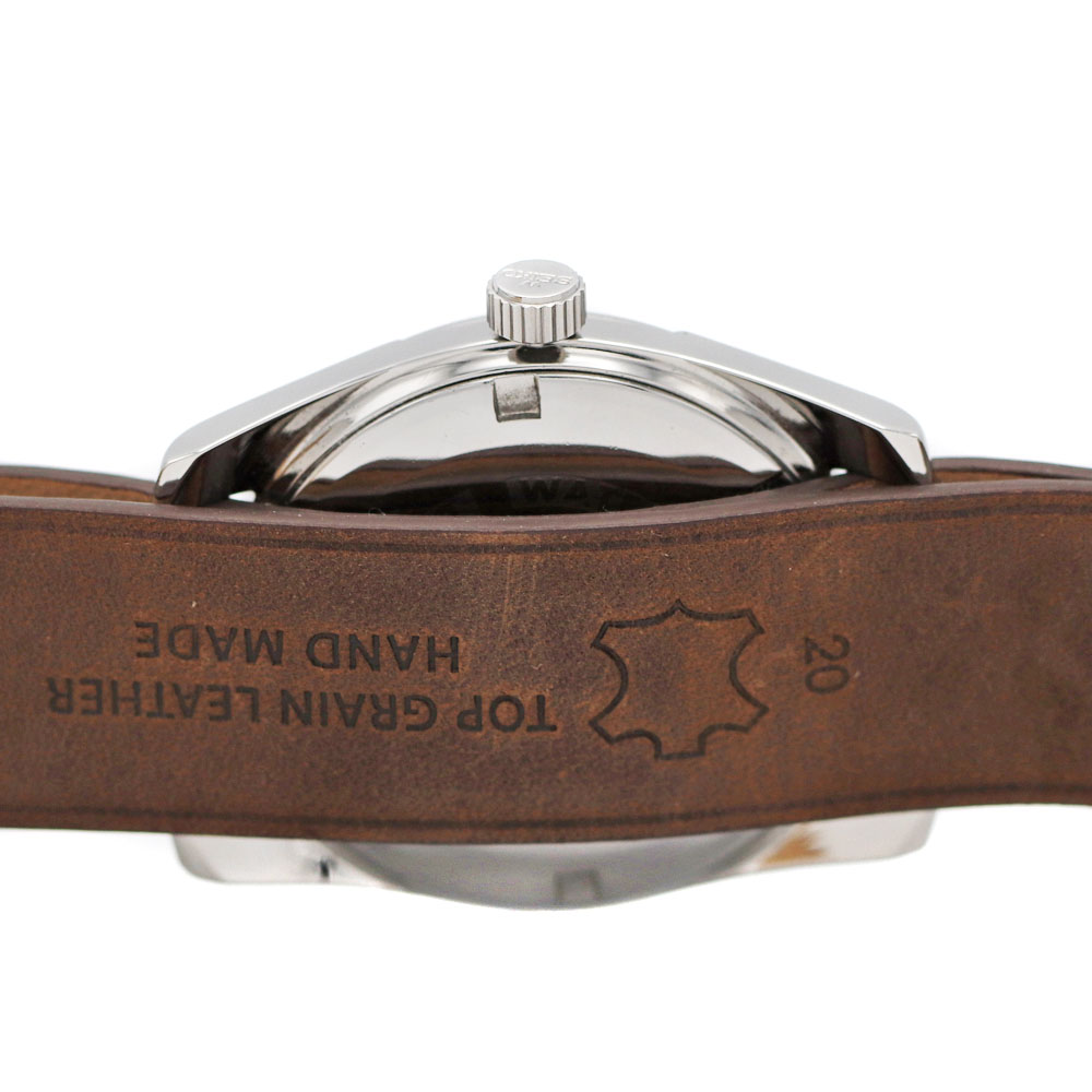 | 素材 | ケース:ステンレススチール ブレス:グレインレザー(社外) ダイヤル:ホワイト 風防(ガラス):プラスチック |