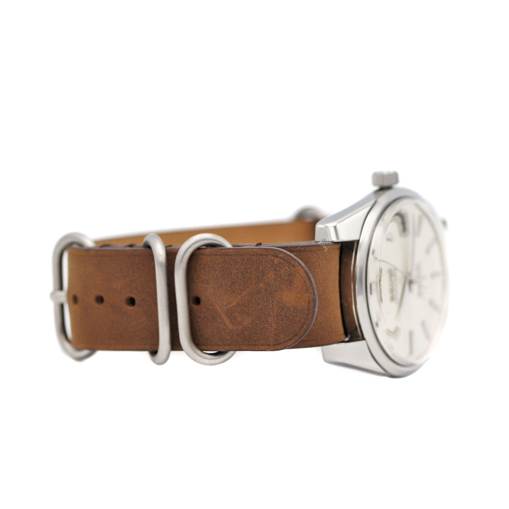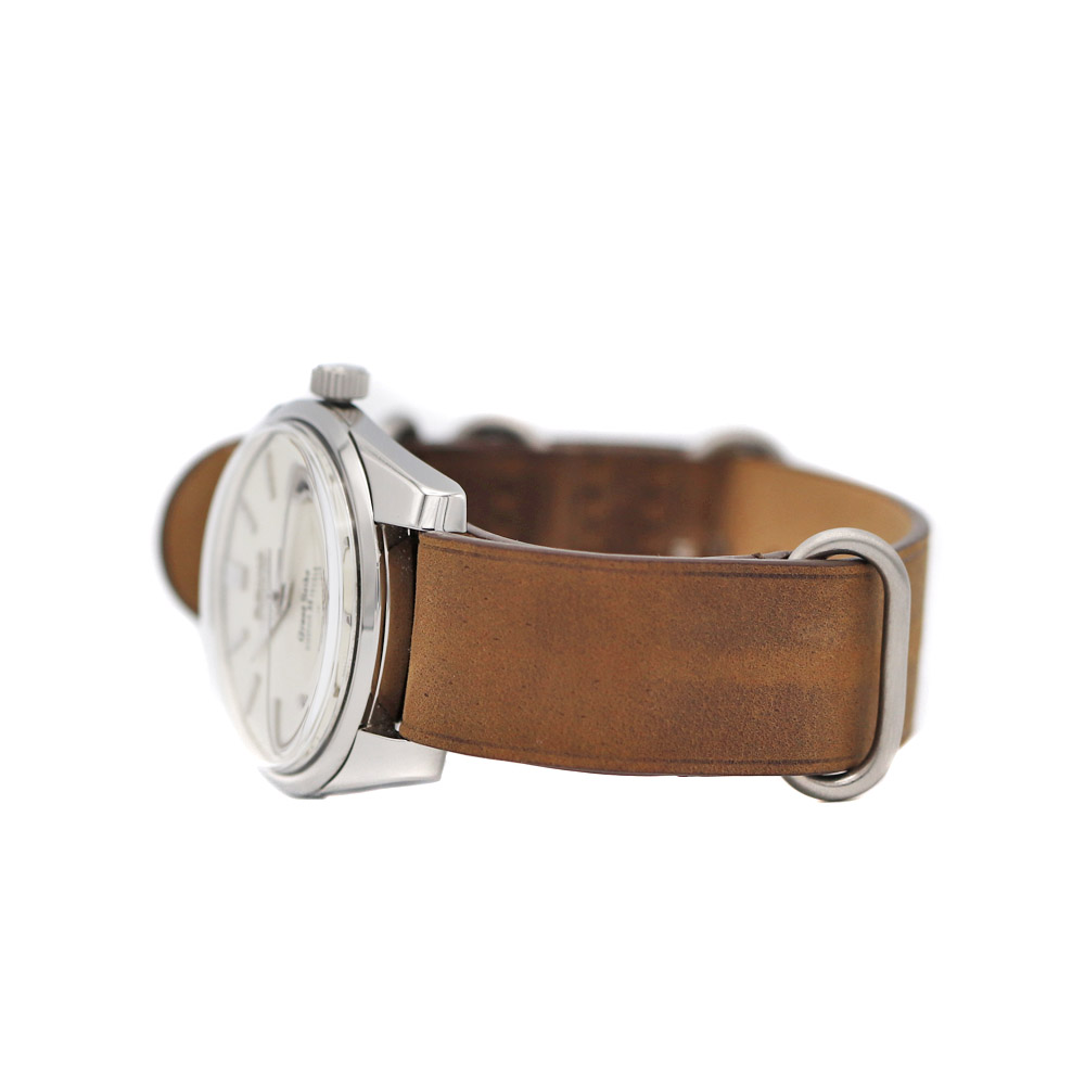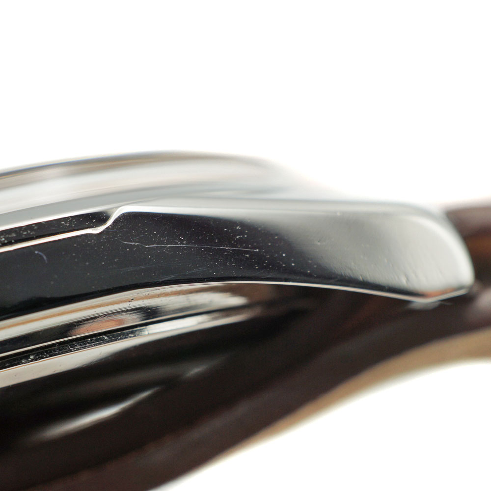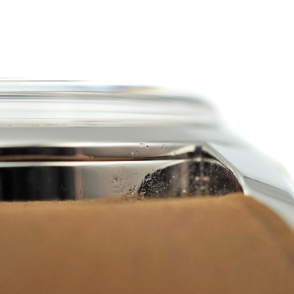 | 素材 | ケース:ステンレススチール ブレス:グレインレザー(社外) ダイヤル:ホワイト 風防(ガラス):プラスチック |